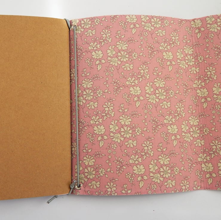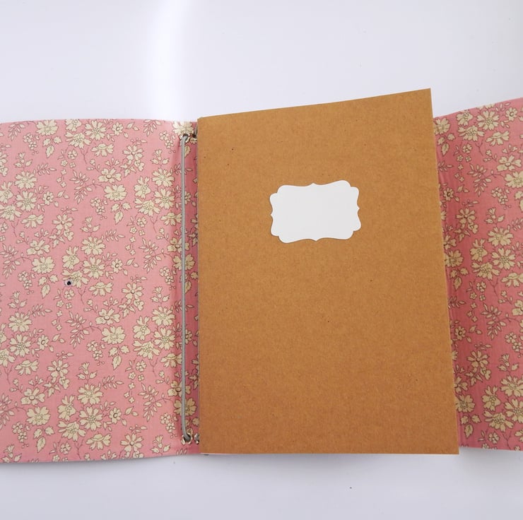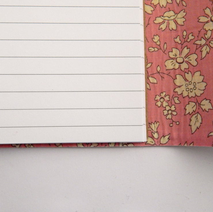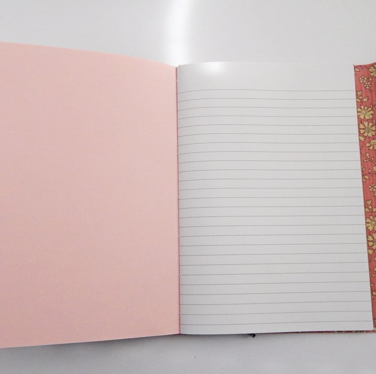 - The cover comes with a kraft card covered notebook, filled with white 80gm, high quality lined text paper, with pastel pink endsheets to match the floral fabric.