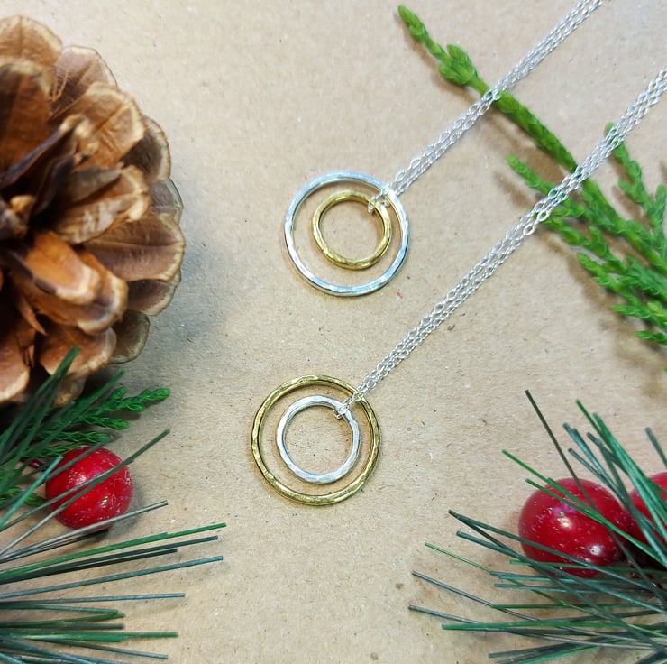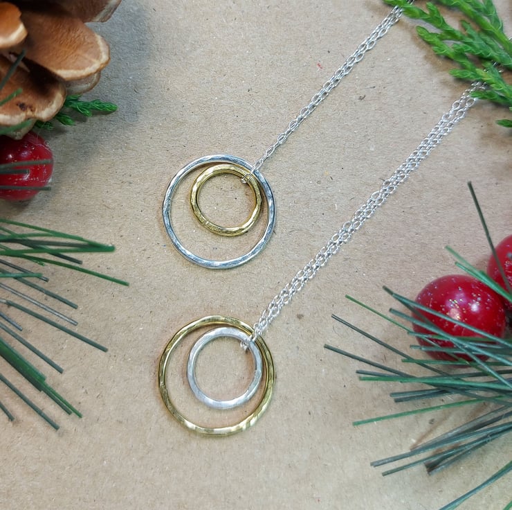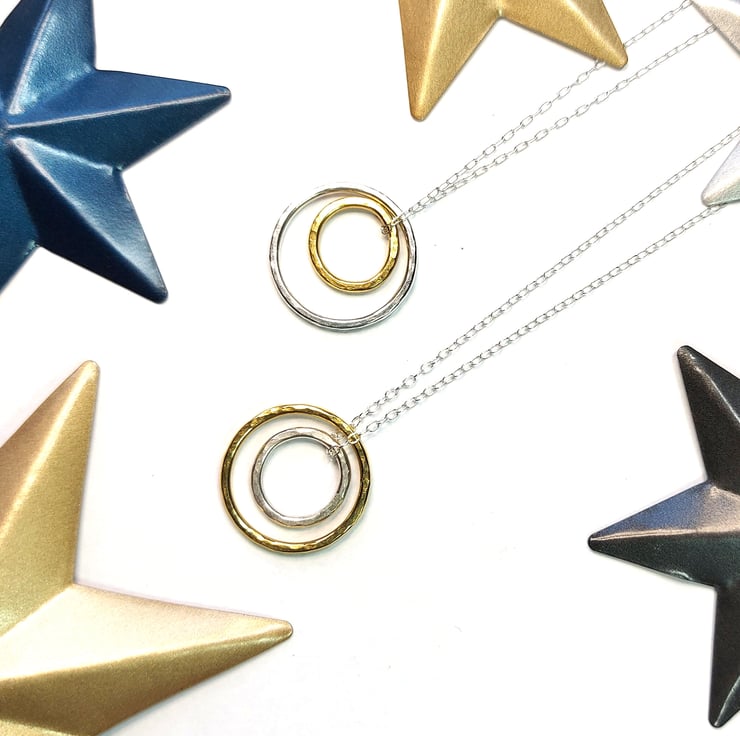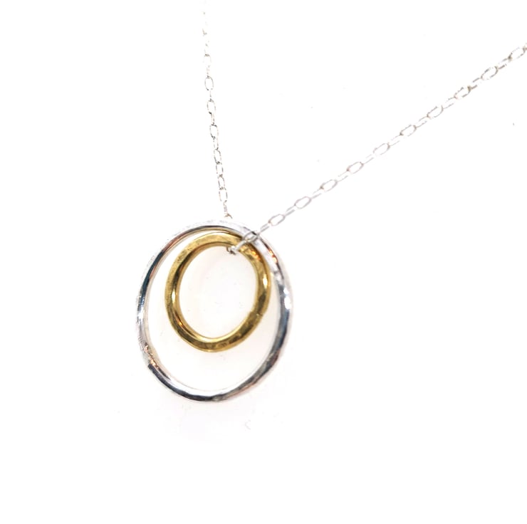 This beautiful two-tone Double Circle pendant necklace with a touch of opulence features a yellow gold vermeil inner circle embraced by a sterling silver outer circle. This handmade pendant seamlessly blends sophistication with glamour, making it a must have piece for your jewellery collection.
