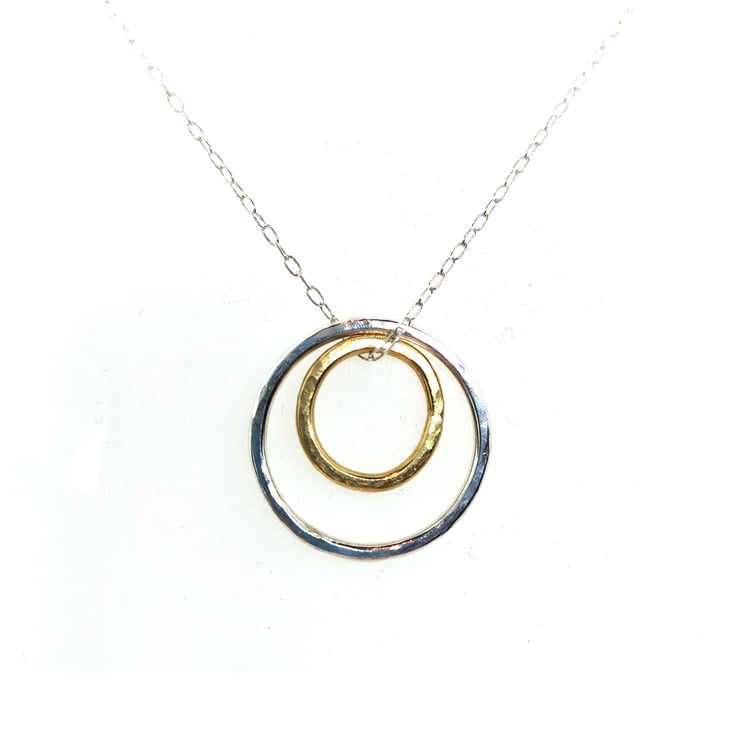 The two circles have a hammered finish and harmoniously come together on a fine silver chain. The smaller, yellow gold vermeil circle gracefully rests within the larger sterling silver circle. The adjustable 16/18" (40/45cm) silver chain ensures a perfect fit, enhancing the versatility of this pretty necklace.