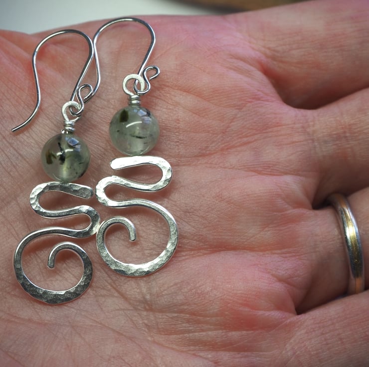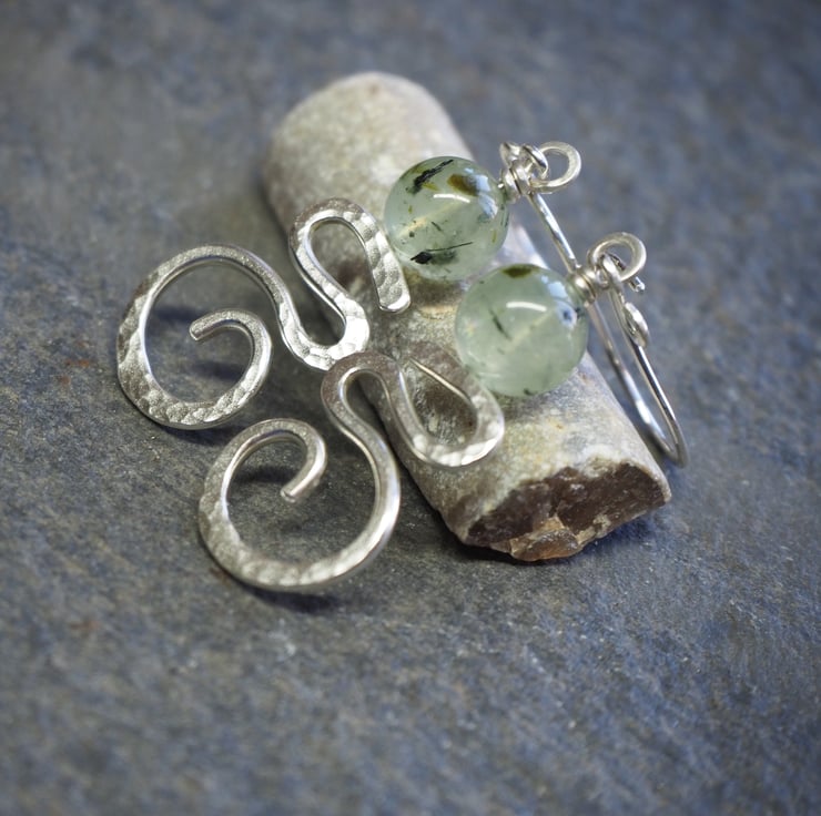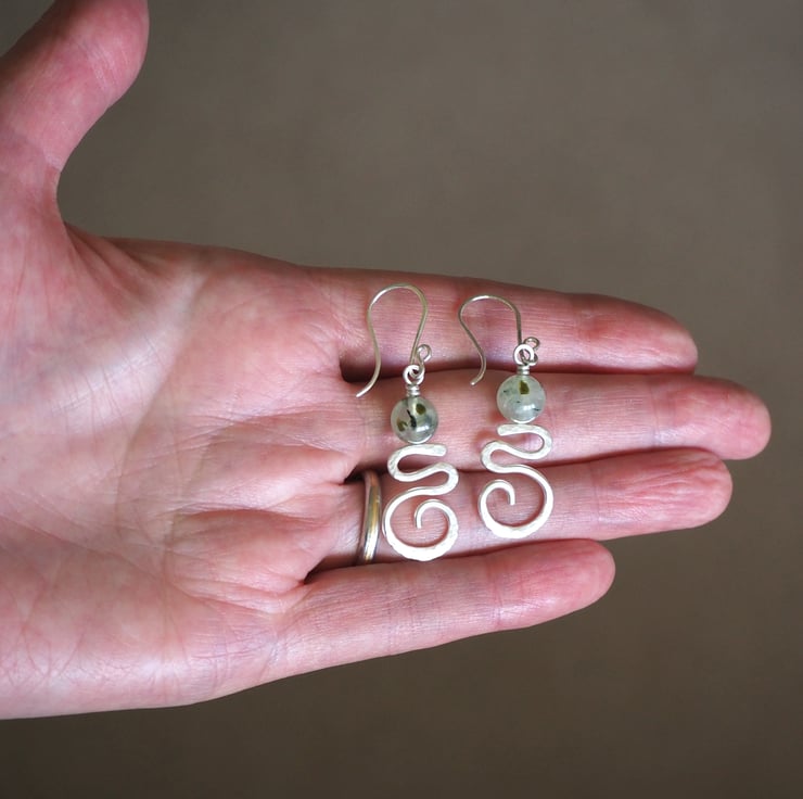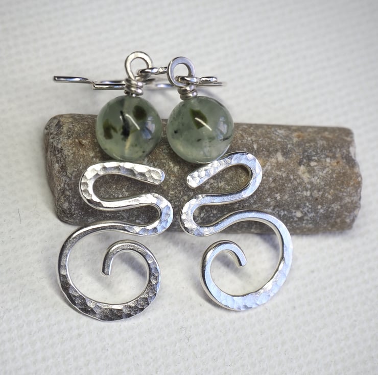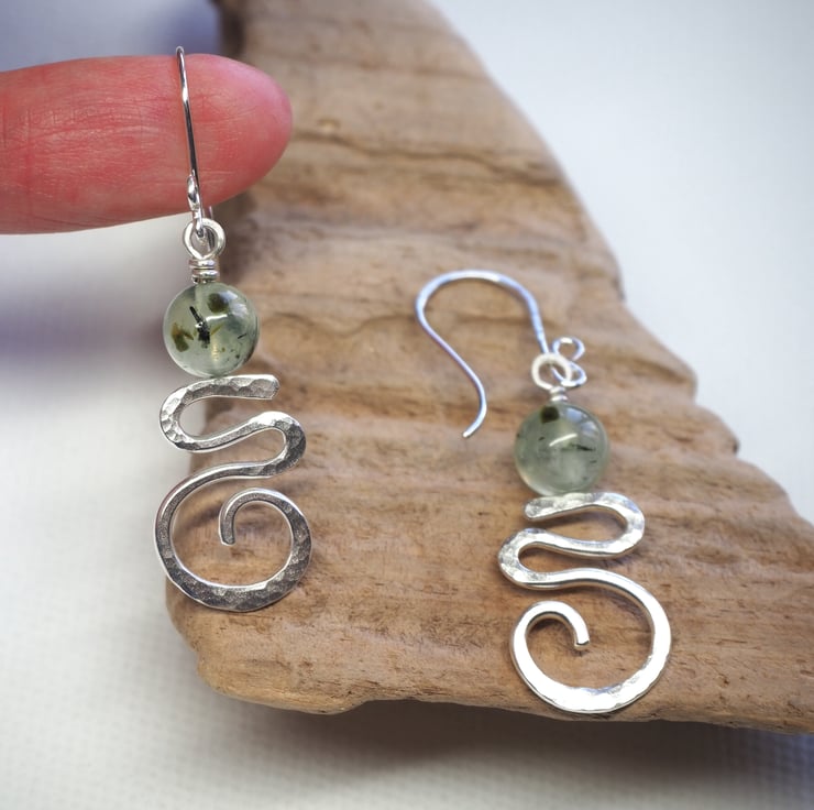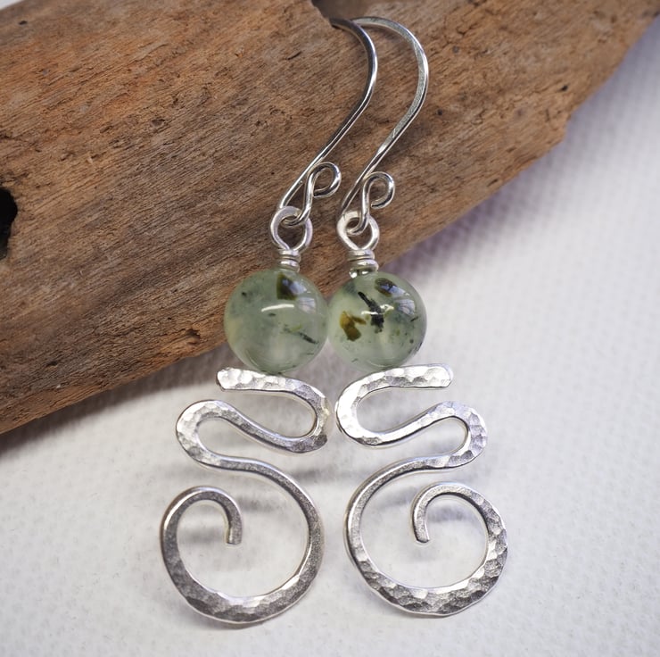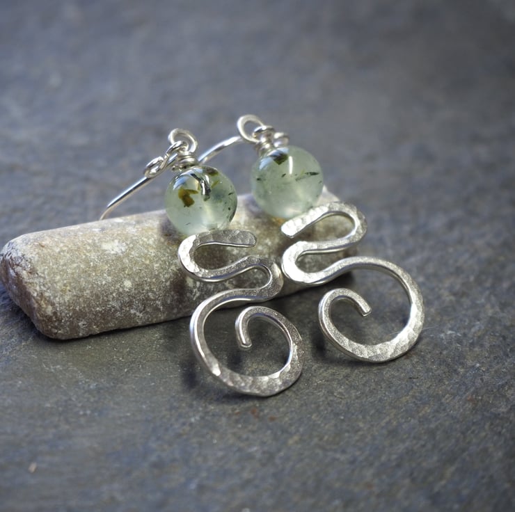 These spiral zigzag silver dangly earrings are hand forged from quality Argentium silver 935 (hypoallergenic and kinder to sensitive skin). They have a zigzag spiral design with a lovely hammered texture and are topped with a pretty green prehnite bead. The earrings are polished to a bright shine to finish.