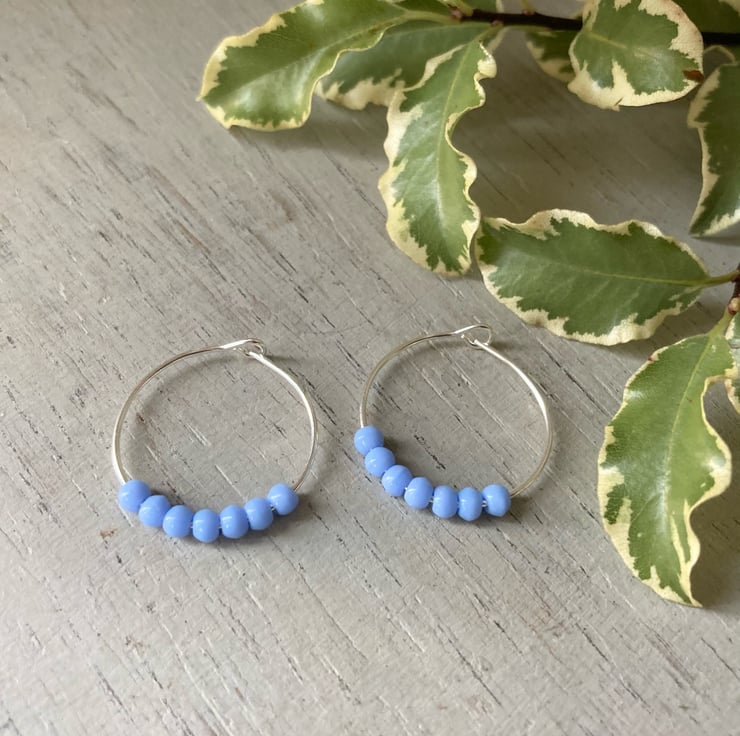 Beautifully simple earrings made with little pale blue beads on sterling silver earring hoops. The beads are 3mm in diameter and the hoops are approximately 2cm in diameter. Other colours are also available.