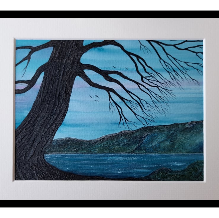Remembering is an original expressive moodscape painting triggered by a memory from a Highlands journey. Loosely based on Loch Duich. The quirky textured tree is symbolic of reaching out into past memories of special places and moments.