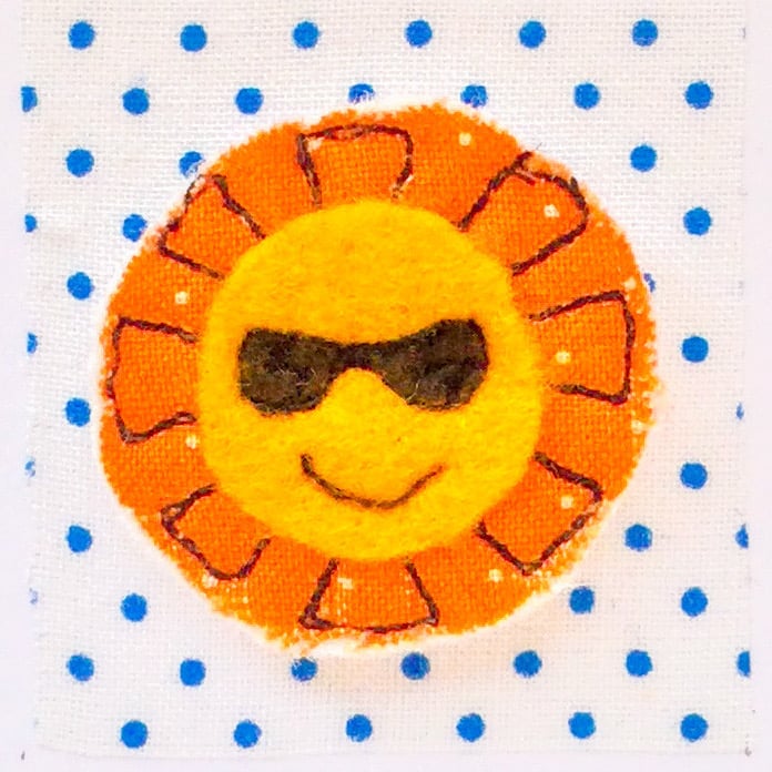 A little fabric and felt sunshine. Made using freemotion embroidery, each sun has his glasses on. But his secret is a hidden magnet so as well as being a lovely card he can be a present too! A nice idea to cheer up your fridge.