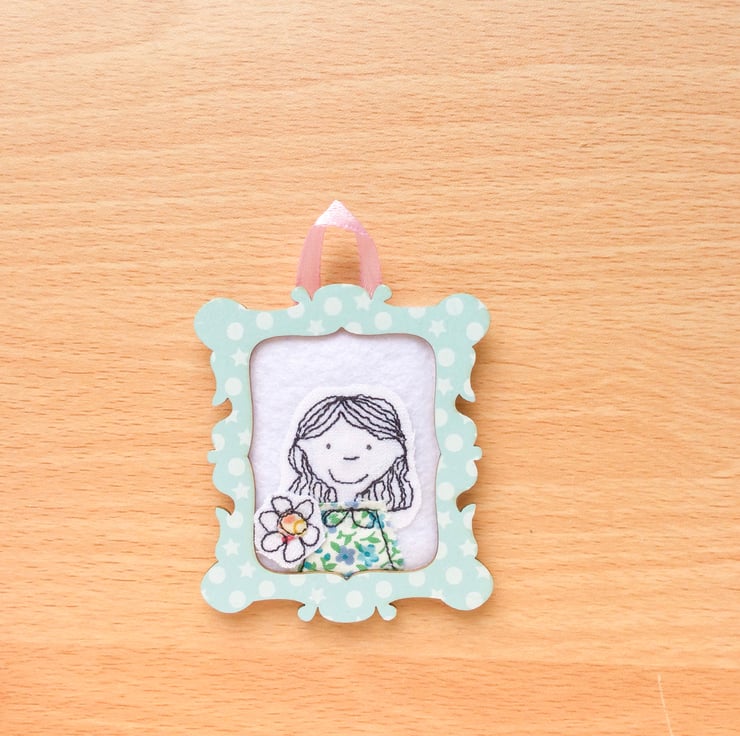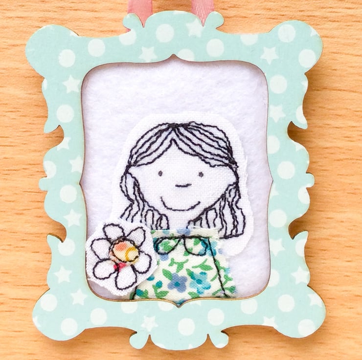 Little people portraits. A design made using freemotion embroidery and felt. Each little person has their own fabric body made using vintage or recycled fabric. The little boys have a tiny star bead and the girls a teeny flower.