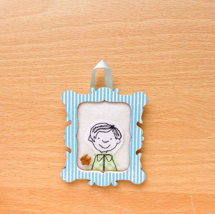 Little people portraits. A design made using freemotion embroidery and felt. Each little person has their own fabric body made using vintage or recycled fabric. The little boys have a tiny star bead and the girls a teeny flower.