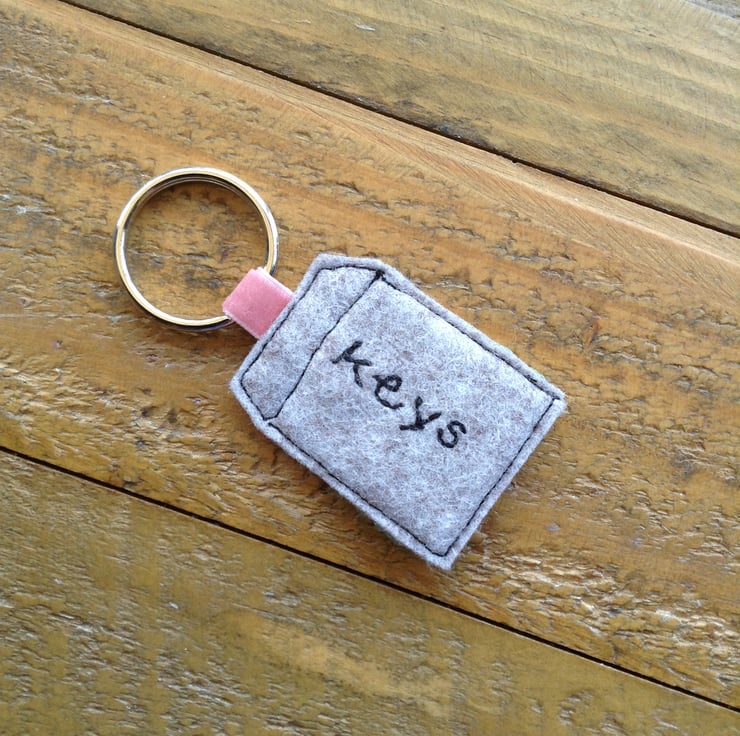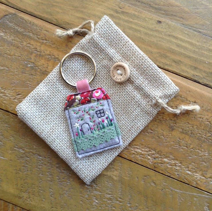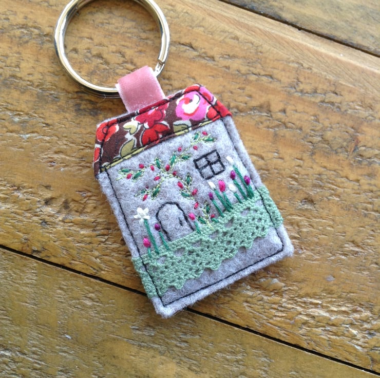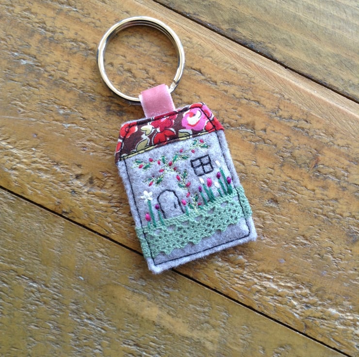 This little cottage key fob is made from wool felt embellished with crochet lace, a Liberty fabric roof,and a hand and machine embroidered garden. The word "keys" is embroidered on the back.