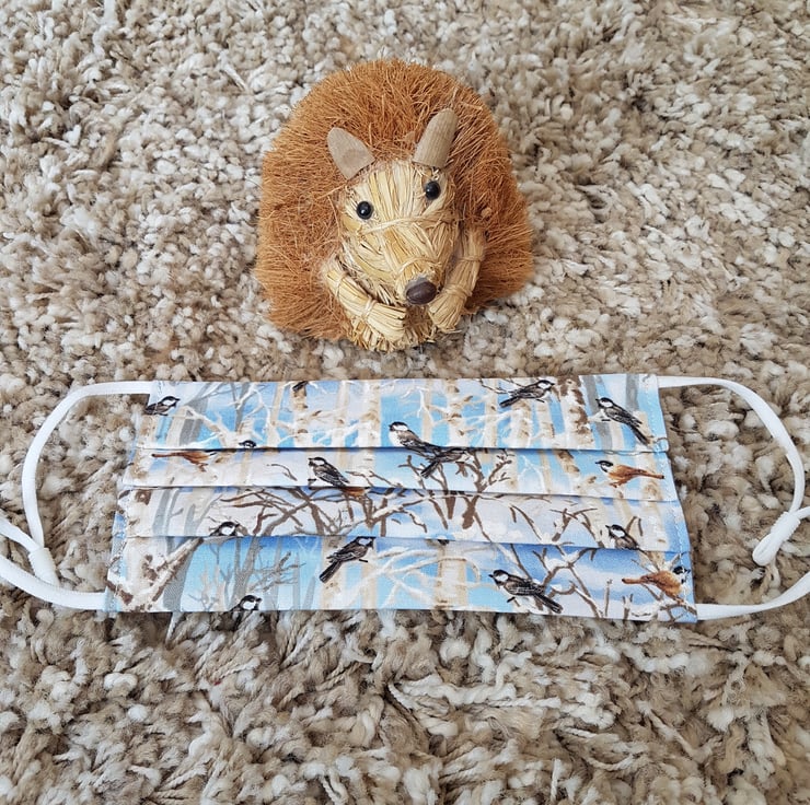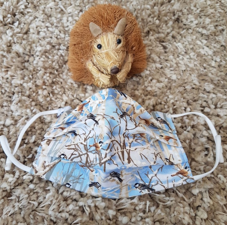 Small Adult/Teenager face covering made from a print of birds in trees print on a pale blue background. The face mask is made with 2 layers of cotton forming an inner pocket for a filter (not included) and is fastened over the ears with 2 loops of elastic and a toggle adjuster.