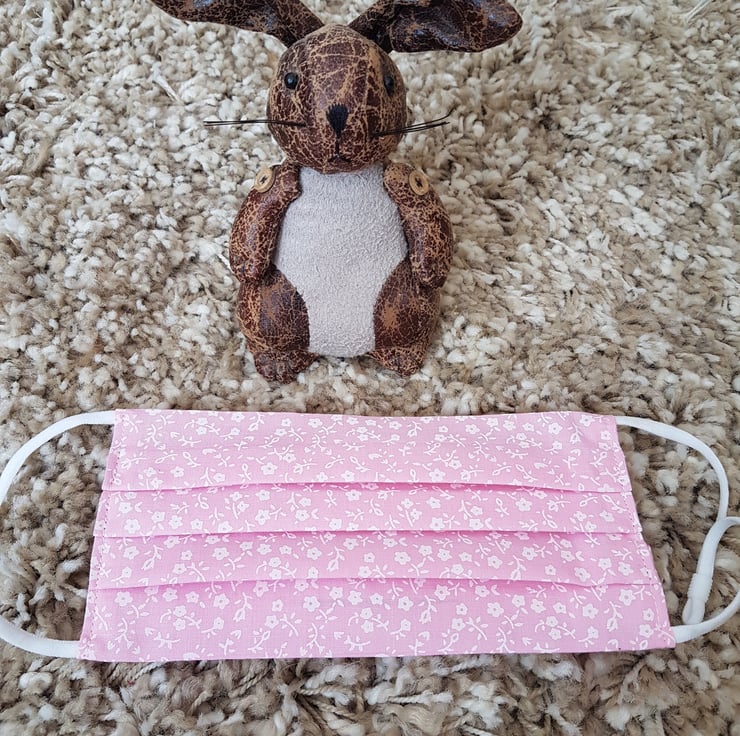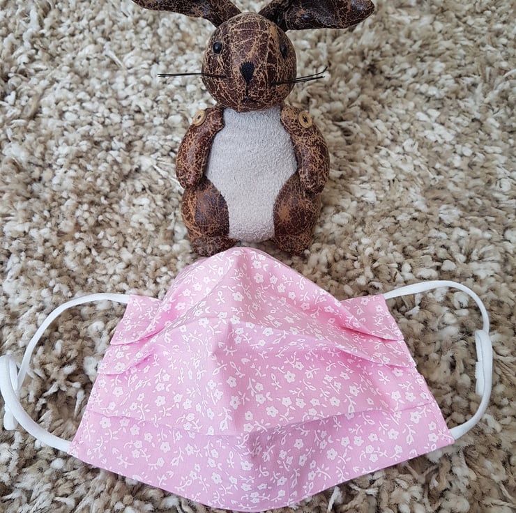 Adult face covering made from a print of tiny white flowers on a pale pink background. The face mask is made with 2 layers of cotton forming an inner pocket for a filter (not included) and is fastened over the ears with 2 loops of elastic and a toggle adjuster.