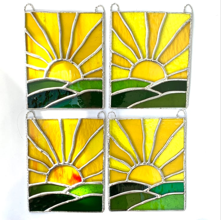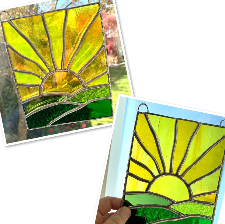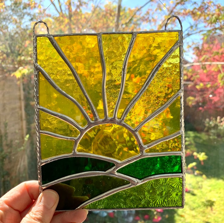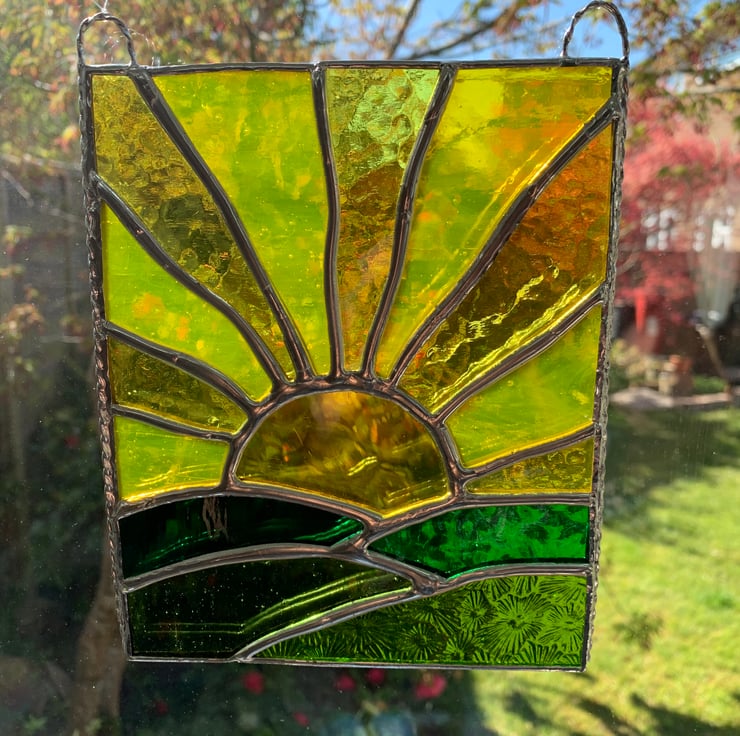 I have used 4 different types of green stained glass for the hills; green corrella glass, green water glass, lime florentine and sage sea glass and three types of yellow glass for the sun and sun rays; yellow water glass, yellow sea glass and a yellow corella glass.