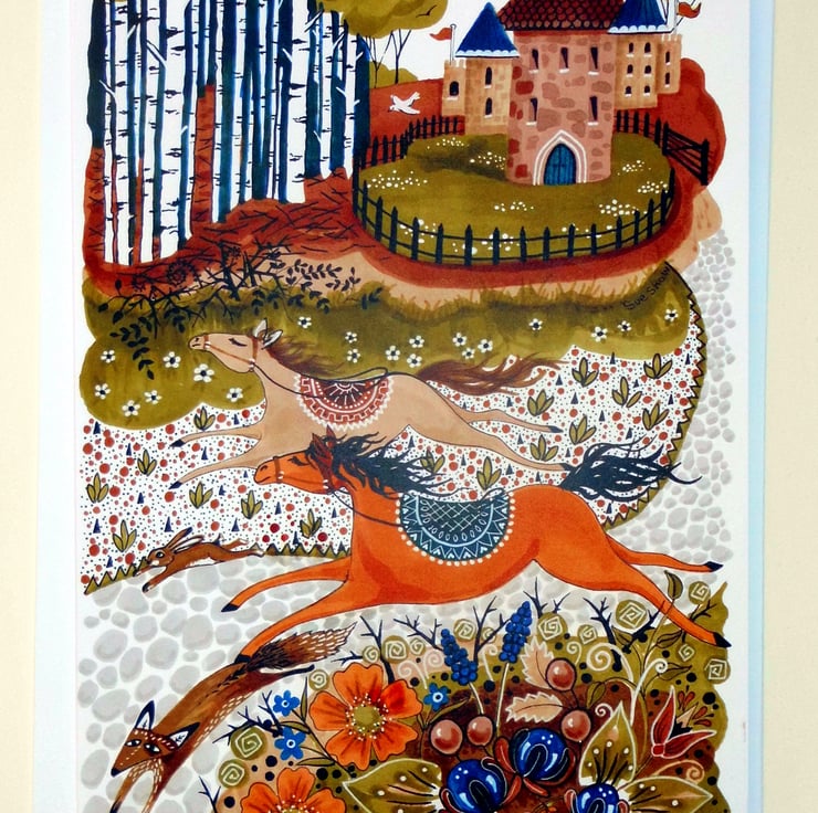 'Free Spirits' was my first horse illustration and using a limited colour pallette of burgundy, green and grey.