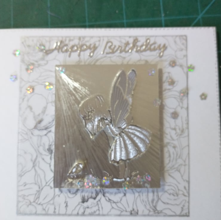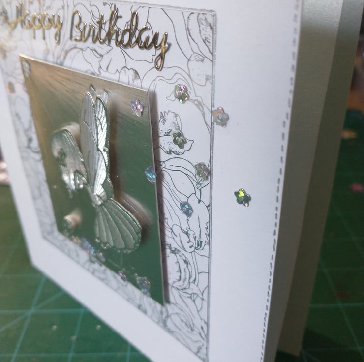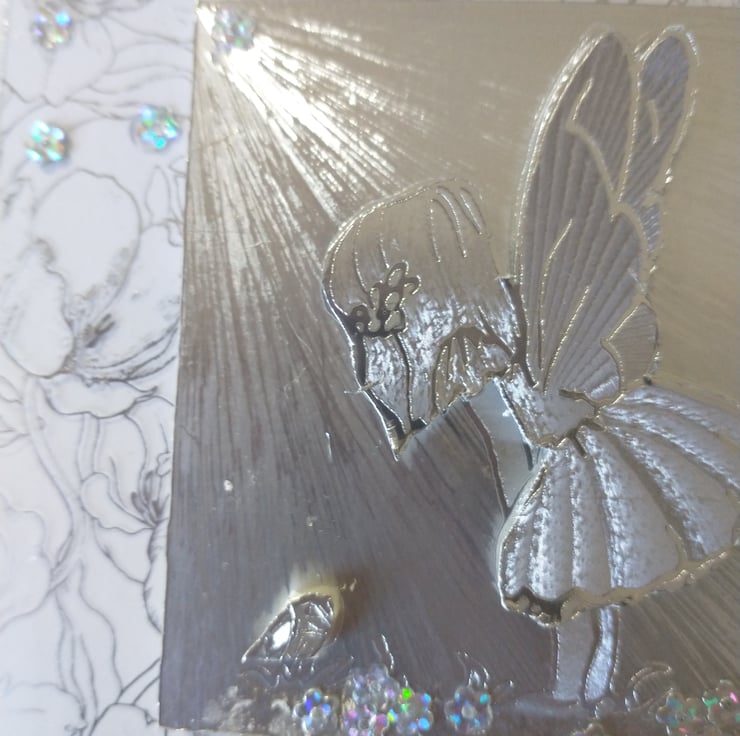 A completely handmade and uniquely designed card. Consisting of a cute fairy decoupage making friends with a robin cut from silver card. Mounted onto foiled vellum then onto pristine white quality card. Happy birthday in silver. Finished off with silver flower sequins