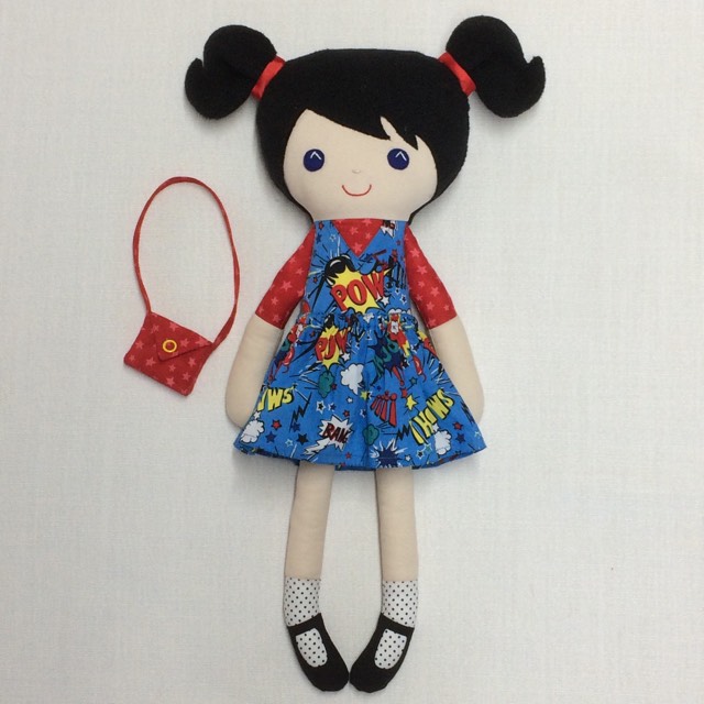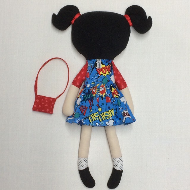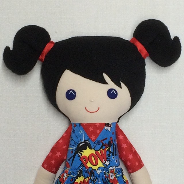 Her black hair is made from soft fleece and is worn in pigtails secured with red ribbons. Her blue eyes are made from felt and her red mouth and tiny nose are securely hand embroidered.