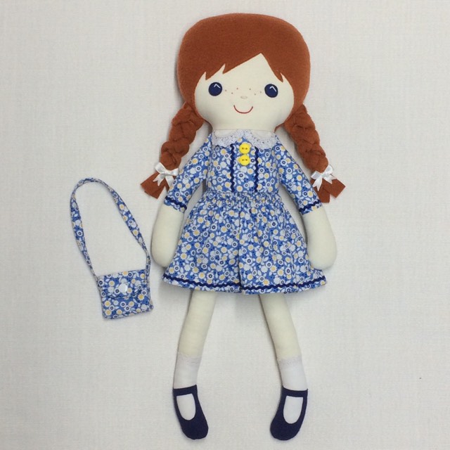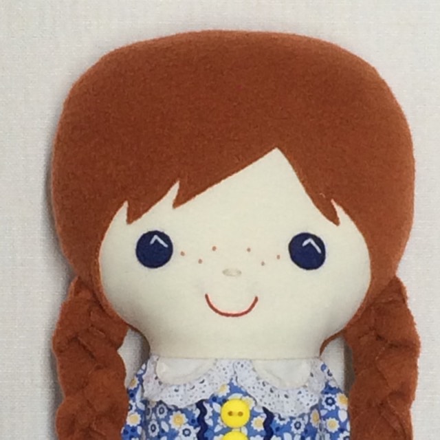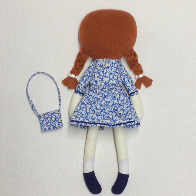 Her ginger hair is made from soft fleece and worn in plaits fastened by white ribbons tied in bows. She has blue eyes which are made from felt. Her red mouth, tiny nose and freckles are securely hand embroidered.