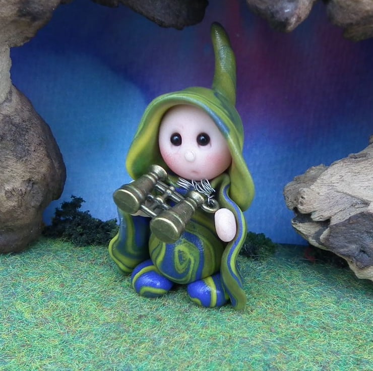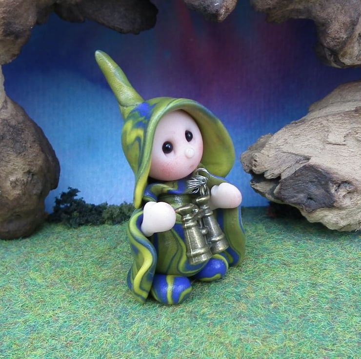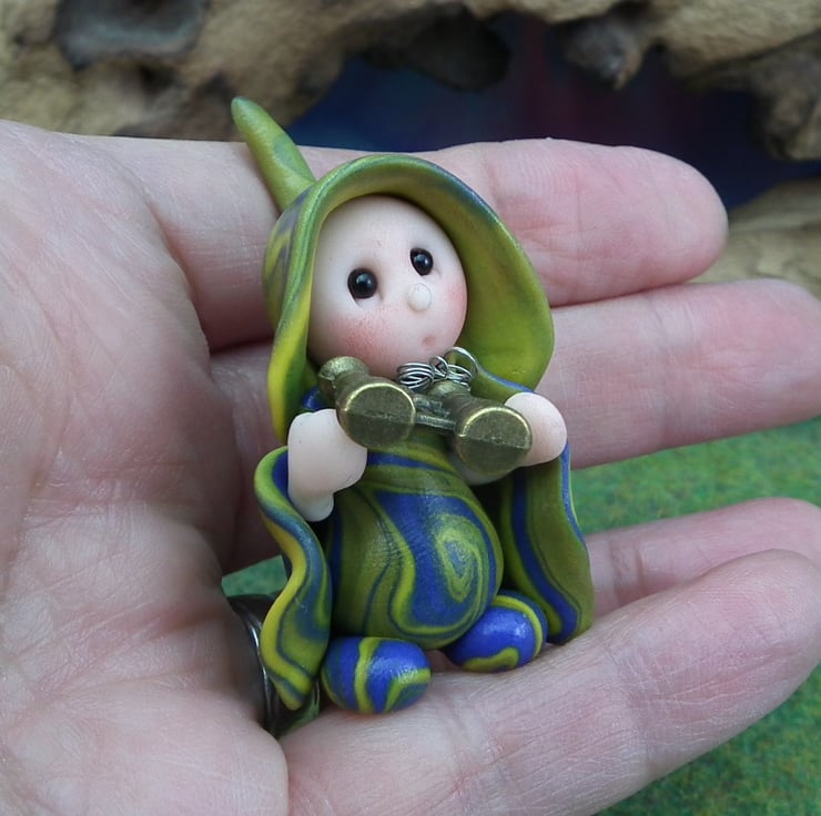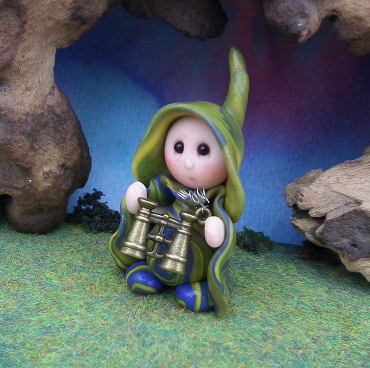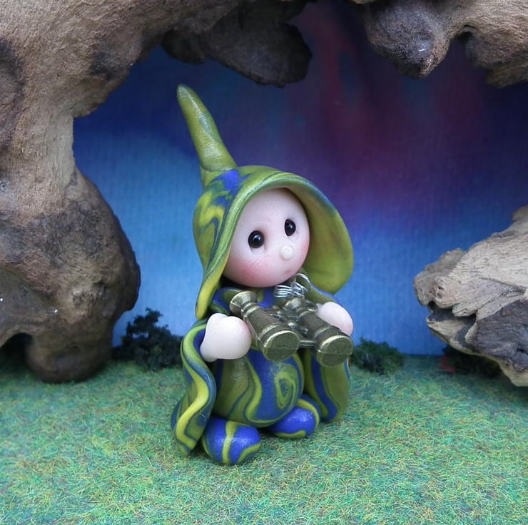 This is a 'one of a kind' creation having been entirely handmade without the use of moulds here at my studio on the Sussex Coast. Modelled with Prosculpt polymers, painted with heat set paints before sealing with lacquer, Ted has sparkling black onyx eyes and a pair of golden binoculars. Ted the Birdwatching Gnome is just one and a half inches tall.