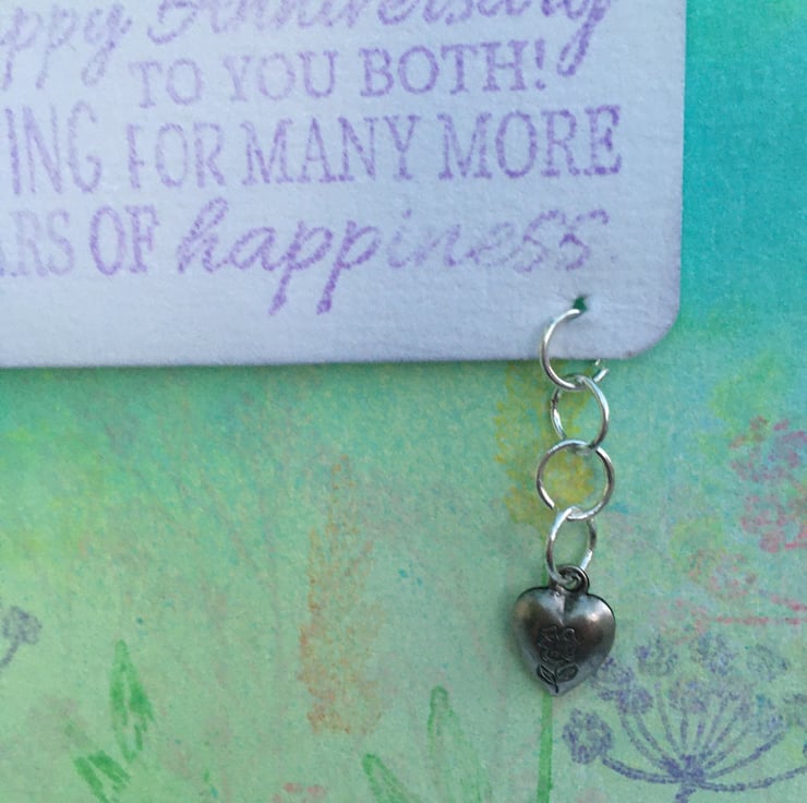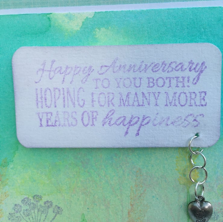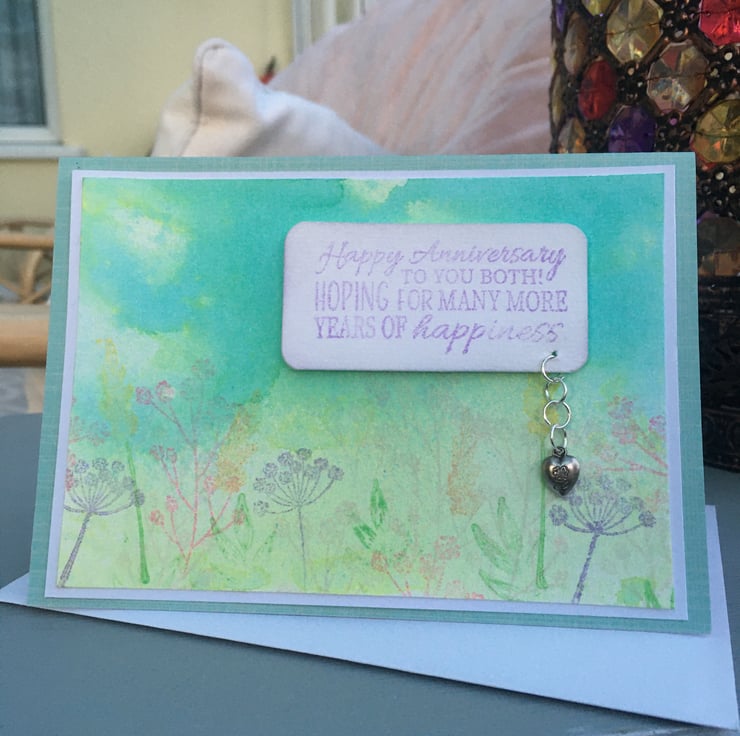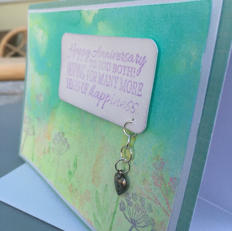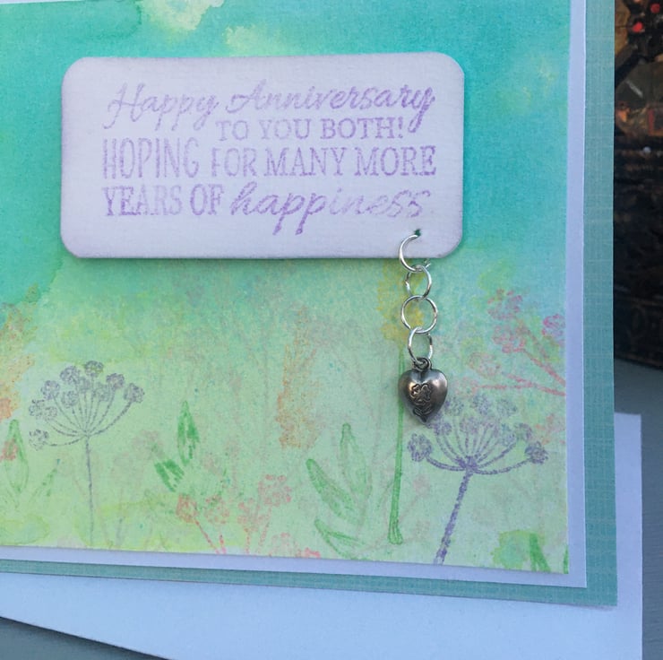 Beautiful delicate and vibrant colours make this anniversary card a must to celebrate a special day. This A6 sized card is full of wildflower detail. The base is a green and blue sprayed background. Over this is a multitude of stamped flowers in delicate colours giving the impression of a meadow. This is mounted on white and green card. The greeting says Happy Anniversary to you both, hoping for many more years of happiness. A small silver heart hangs from the greeting.
