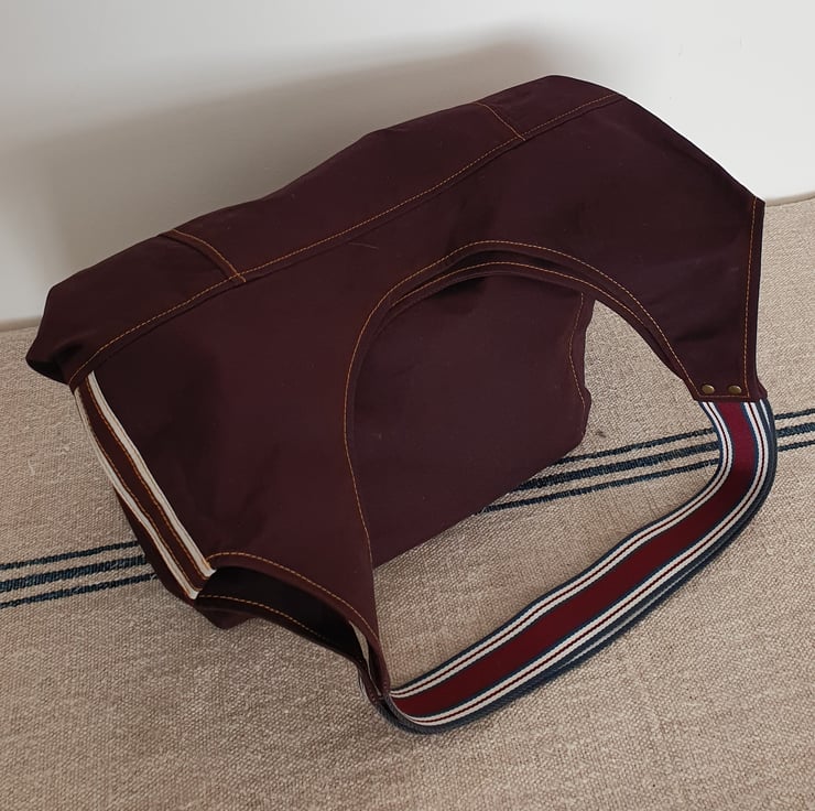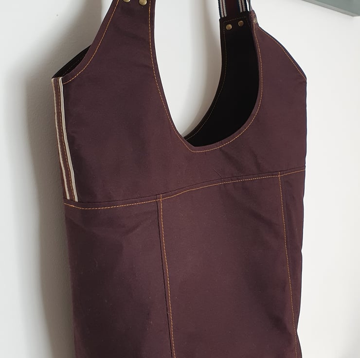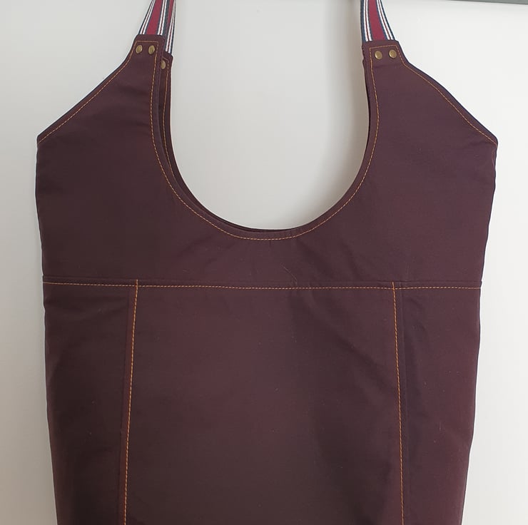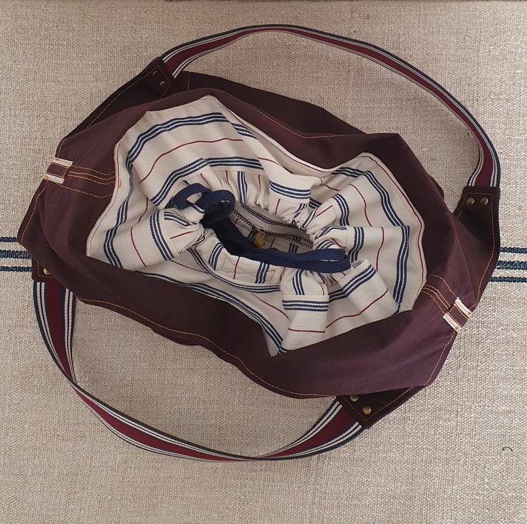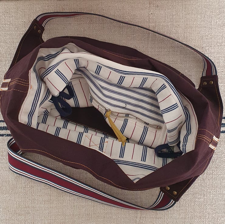 A stripped webbing for the handles, which are riveted to the bag for strength.