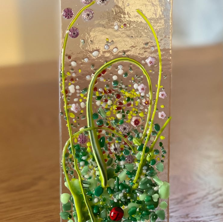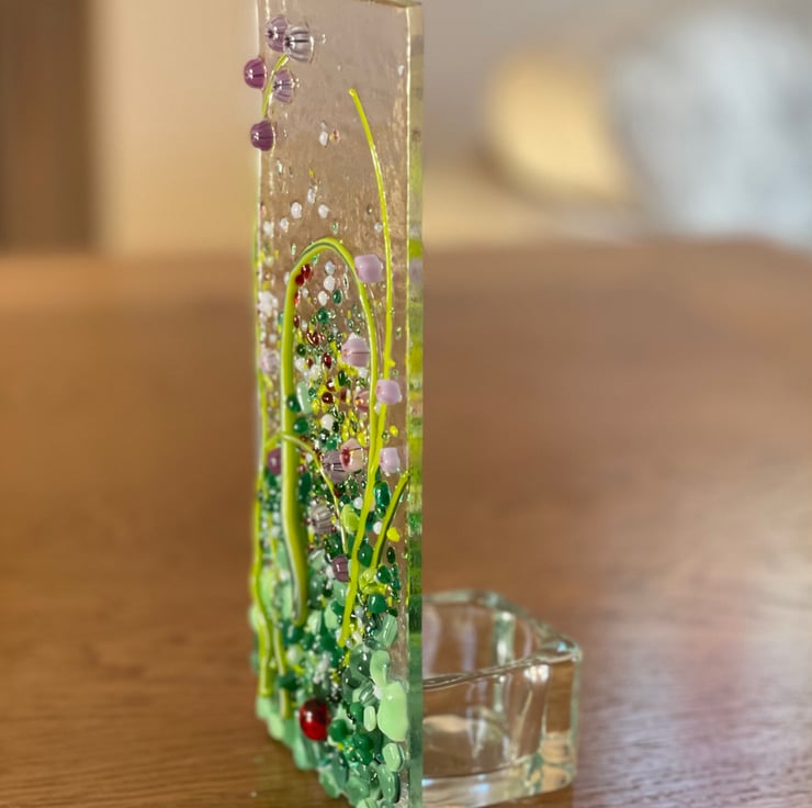 A beautiful handmade fused glass tea light holder with a cute little ladybird, painted with glass enamel, nestled on the foliage.