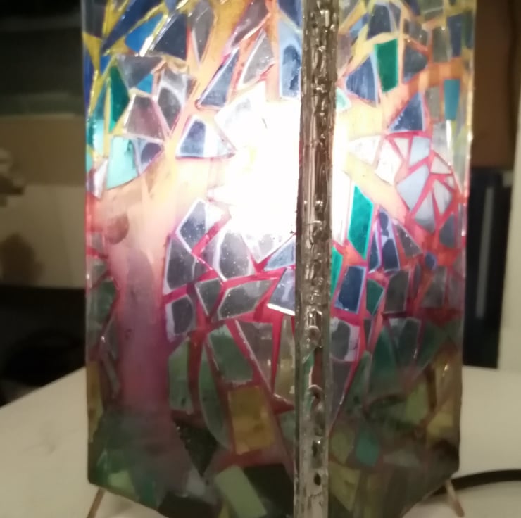 This colourful translucent lamp makes a beautiful display piece as a small sculpture when illuminated with natural light as well as becoming a beautiful lamp after dark. It is sized 20 x 10 x 10 cm and comes with a 2m electric lead with switch.