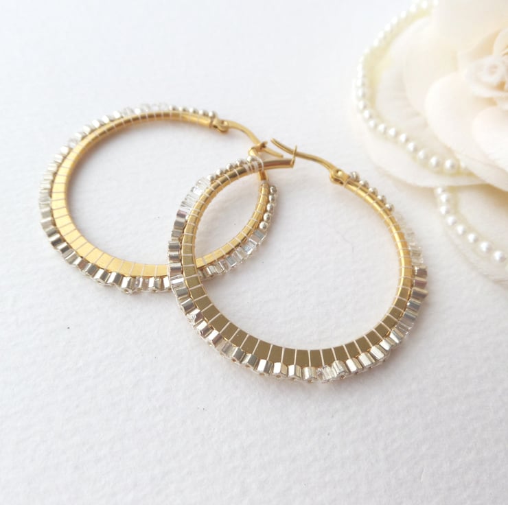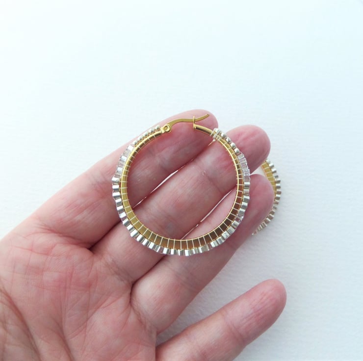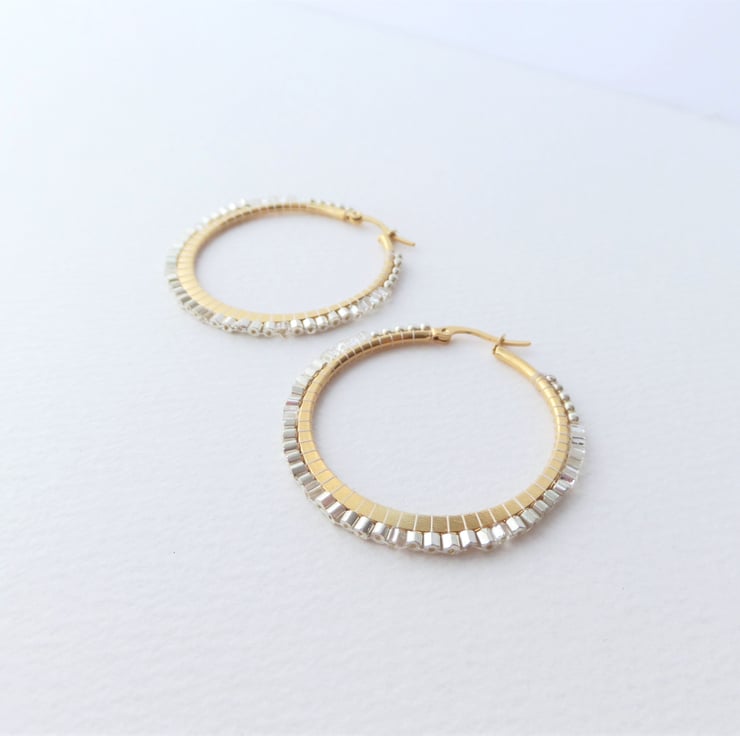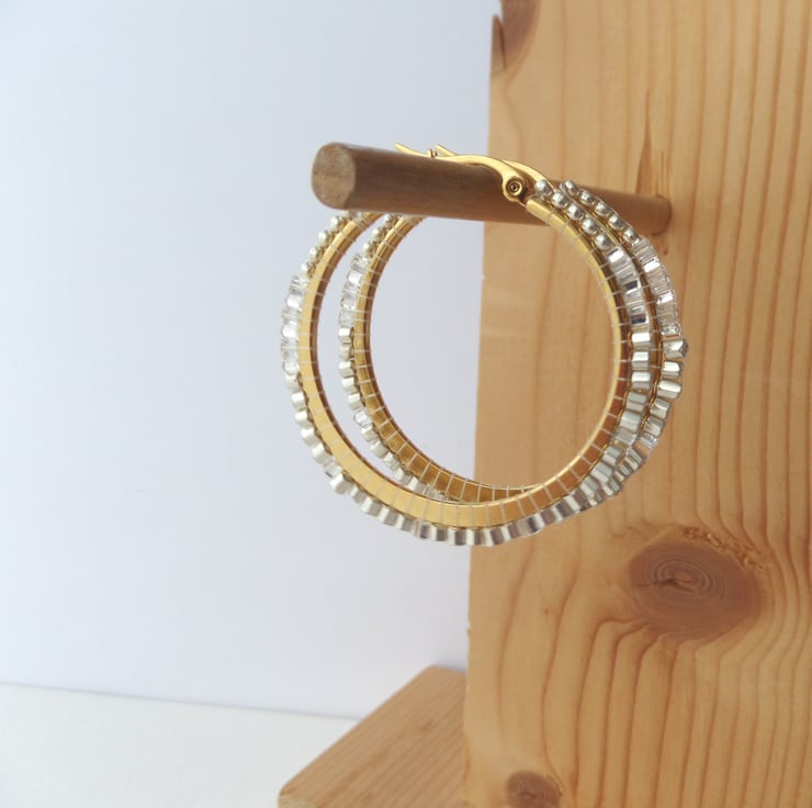 A beaded hoop earring with a good medium sized diameter, hand-beaded around the outside with tiny silver beads at the top, then some unusual silver lined glass tube beads giving them a slightly organic look.