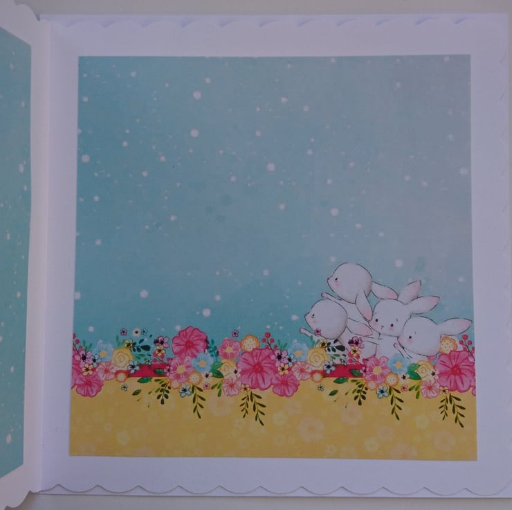 The 3D flowers have been hand cut and gold foiled with matching gem centres. The 3D greeting is also gold foiled and says "Hoppy Birthday".