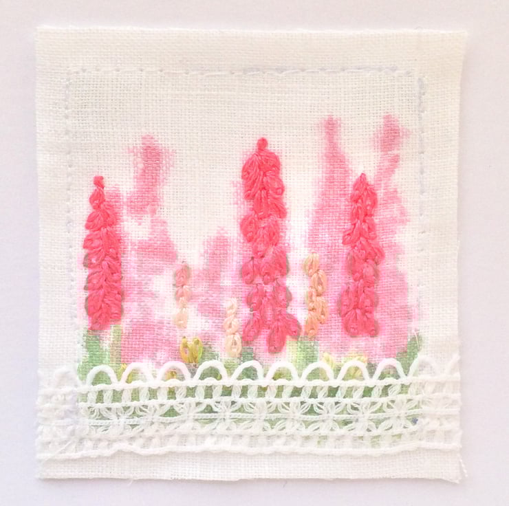 Mixed media design made using linen, lace and hand embroidery. Hand painted foxgloves have been freemachined and then hand stitched foxgloves are complemented by a tiny lace fence.