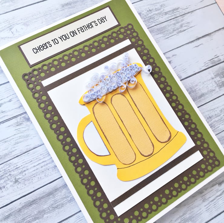 It features a beer glass cut from card with some inked edges to create a 3D look. The froth has been created with white coils of paper using a quilling technique. The brown mat has a bubble-effect border and is mounted on a dark green mat and an ivory pearlised card. The greeting reads “Cheers to you on Father’s Day”