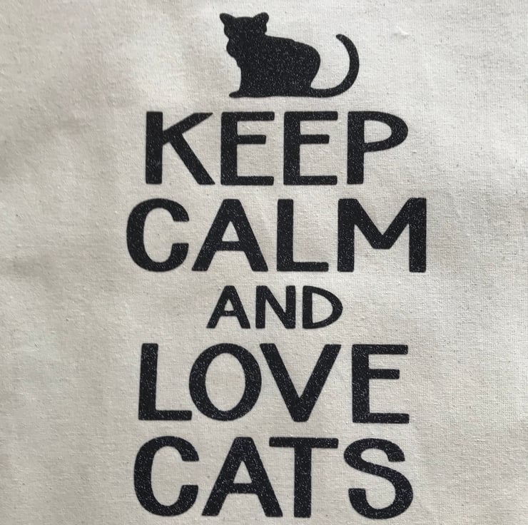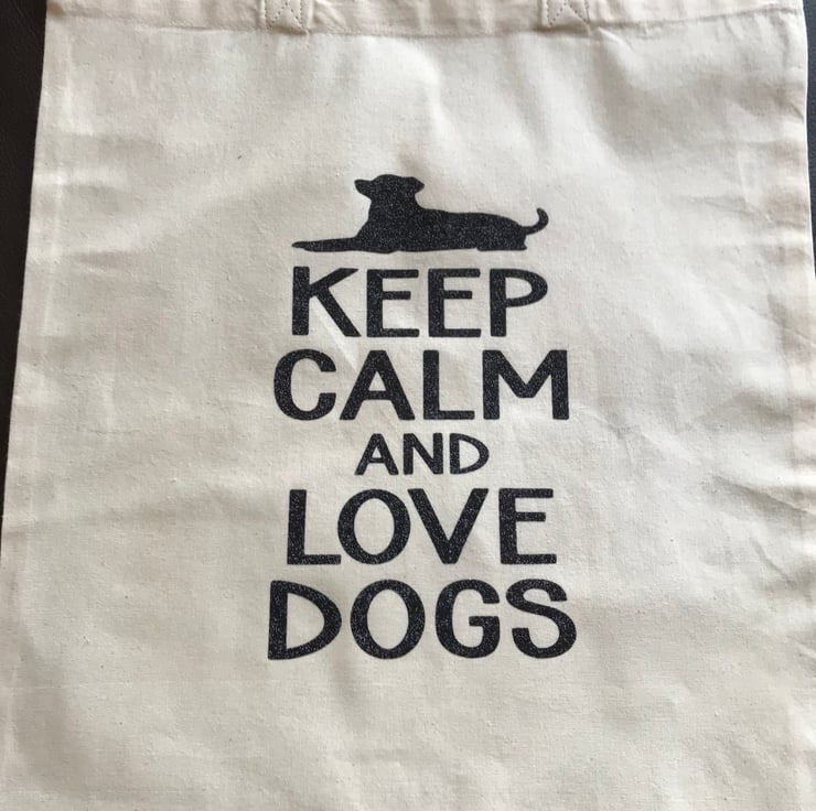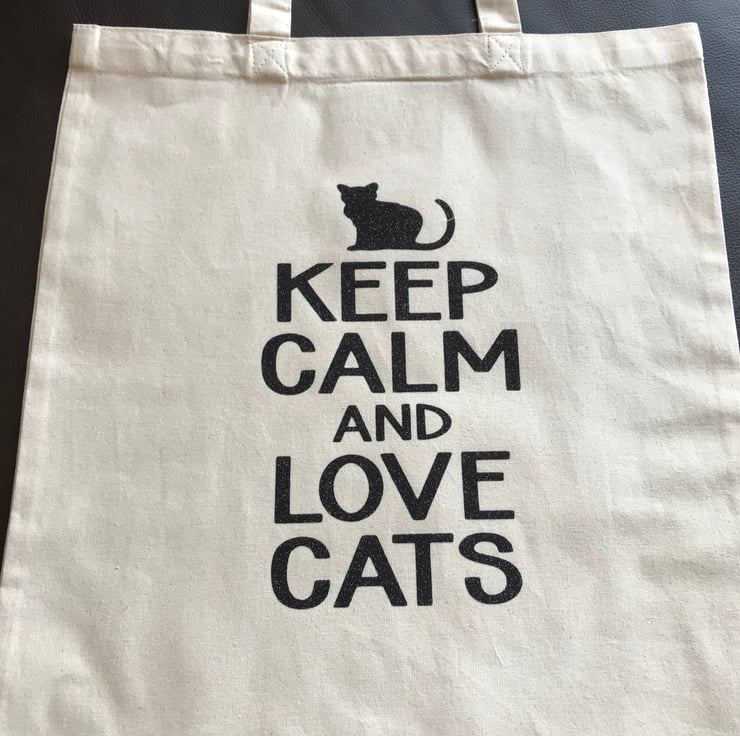 Tote bag with the words keep calm and love cats and keep calm and love dogs in black glitter vinyl.