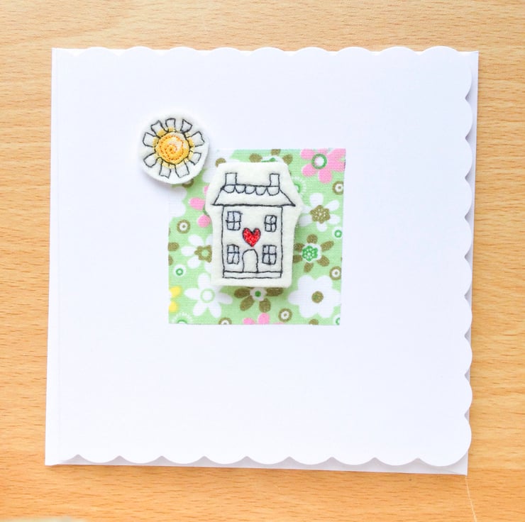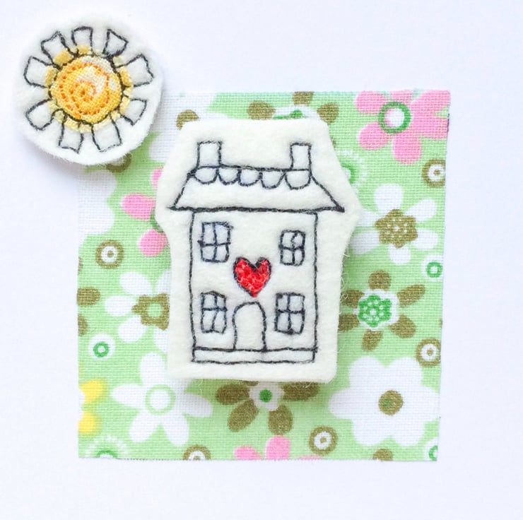 Card design made using freemotion embroidery. Each tiny house has been stitched onto thick wool felt with a teeny piece of recycled or Liberty pattern fabric. The house itself has a magnet glued behind, so would be an ideal present for a new home owner.