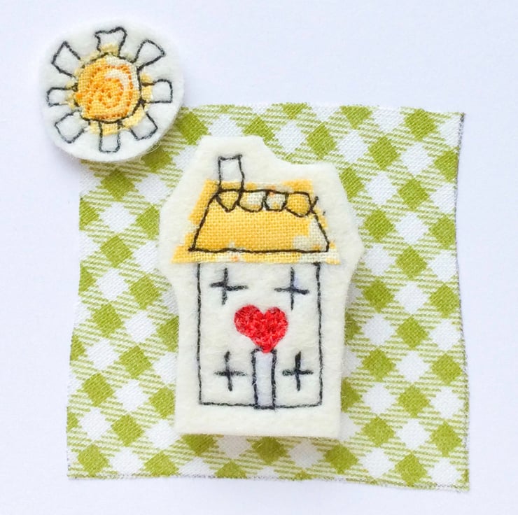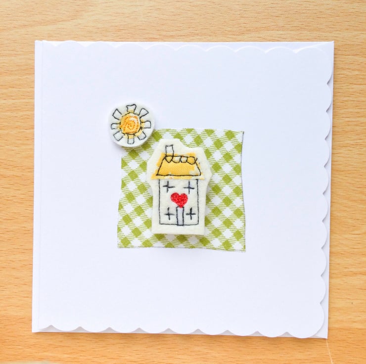 Card design made using freemotion embroidery. Each tiny house has been stitched onto thick wool felt with a teeny piece of recycled or Liberty pattern fabric. The house itself has a magnet glued behind, so would be an ideal present for a new home owner.