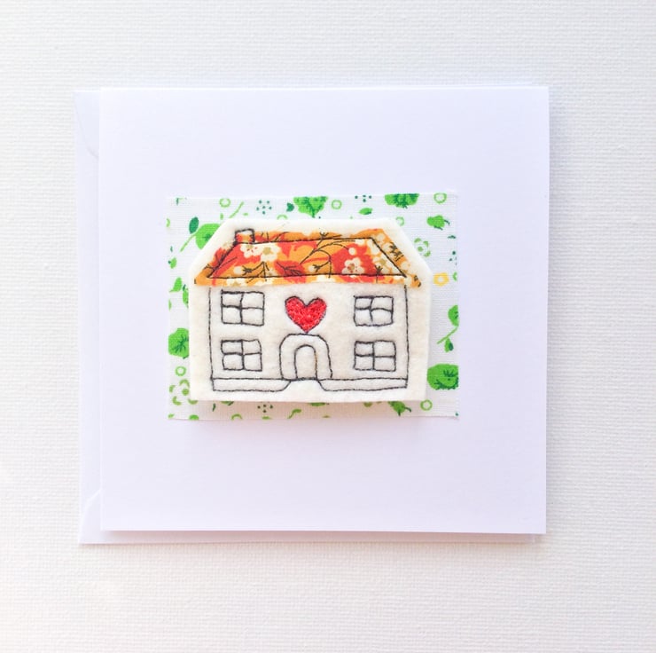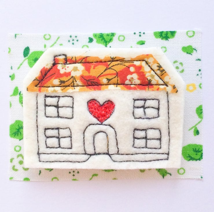 Card design made using freemotion embroidery. Each tiny house has been stitched onto thick wool felt with a teeny piece of recycled or Liberty pattern fabric. The house itself has a magnet glued behind, so would be an ideal present for a new home owner.