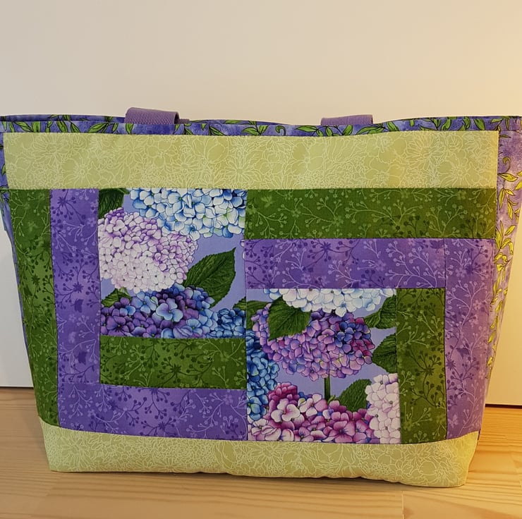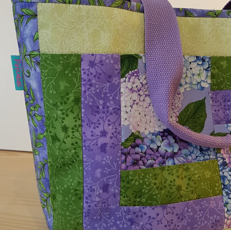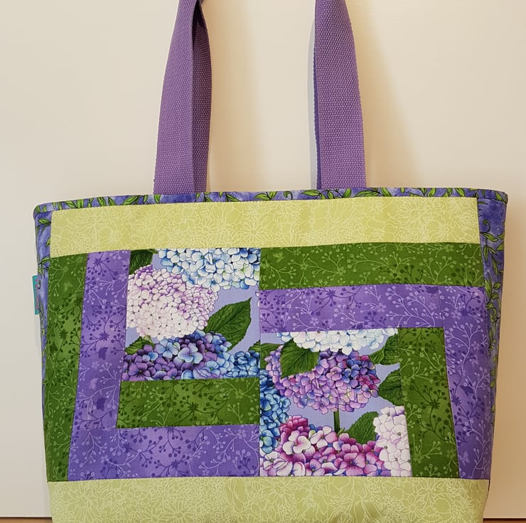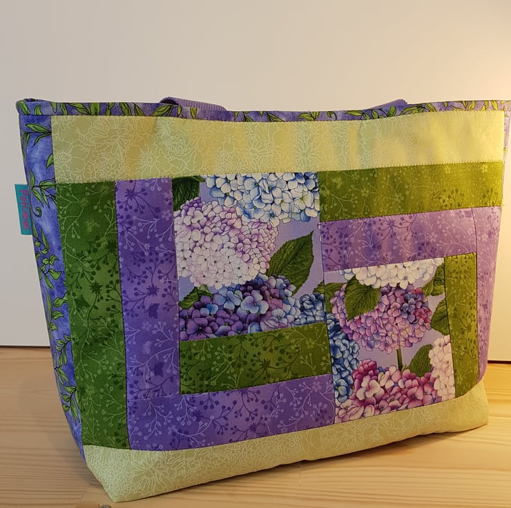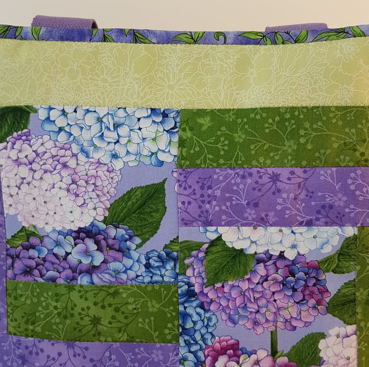 Big patchwork tote bag/shopping bag with hydrangea pattern. Made from cotton and polycotton fabrics in lilac and geen colours. Can use as a handbag or as a shoulder bag. Dimensions: width: 46cm on the top,hight: 28cm,depth :13,5 cm on the bottom on the bag. The handles are 61cm,made from cotton webbing with cord inner on the top of the handles. The bag has waterproof lining and inner pocket with zipper closure.