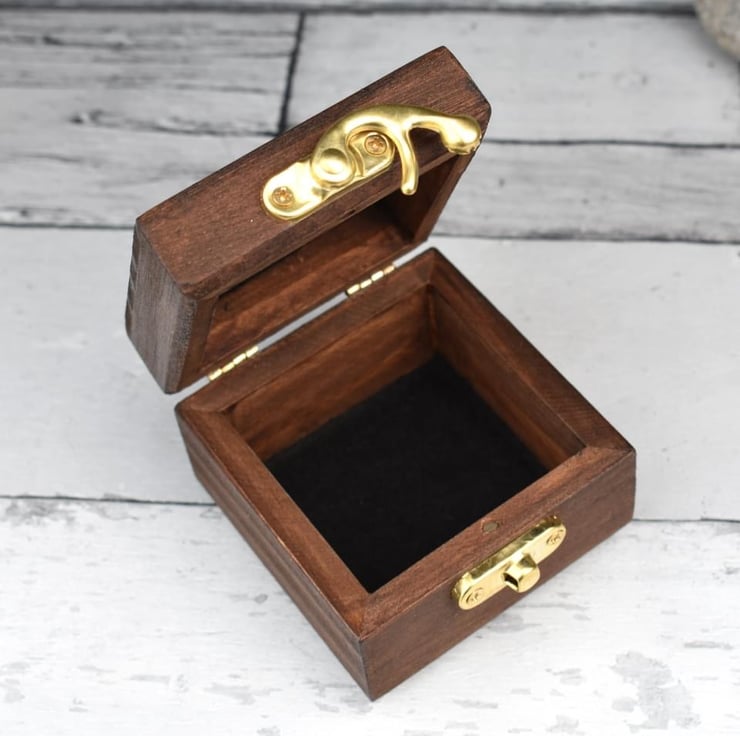 This is by no means a perfect box. I tend to rescue unloved pieces and upcycle them. There may be areas of glue and uneven stain. Brass coloured hinges and clasp. Coloured with art pencils and stained, sanded and varnished. Rubber bumpers to base. Lined with black felt.