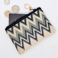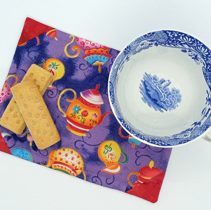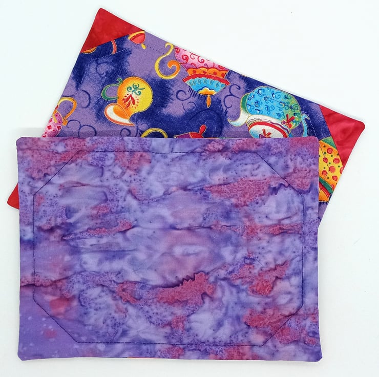 Spacious enough for your cup or mug and some biscuits it measures 16cm X 22cm and is wadded and quilted. This one has corners in vibrant red, and the back is purple batic.