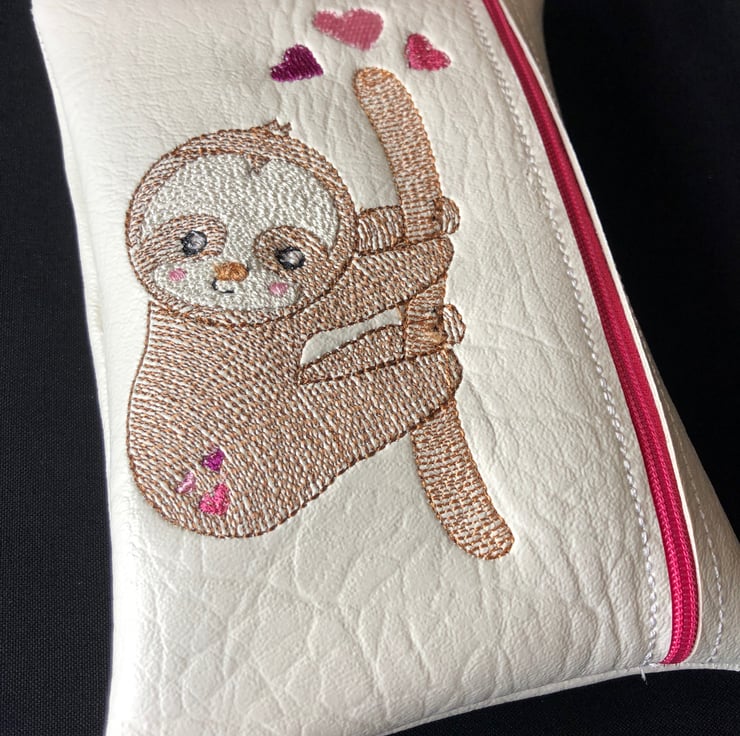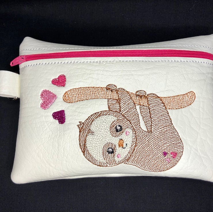 The sloth design is embroidered on and it has a zip opening.