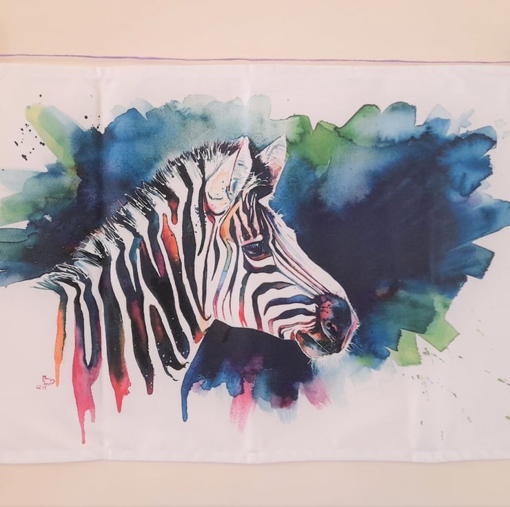 This tea towel features my popular Zebra design, taken from an original watercolour painting. It has been made in the UK using 100% organic cotton, and measures 44cm x 72cm. The tea towel is hemmed on all sides, is machine washable, and the colours are locked in to remain vibrant with minimal fade over time!