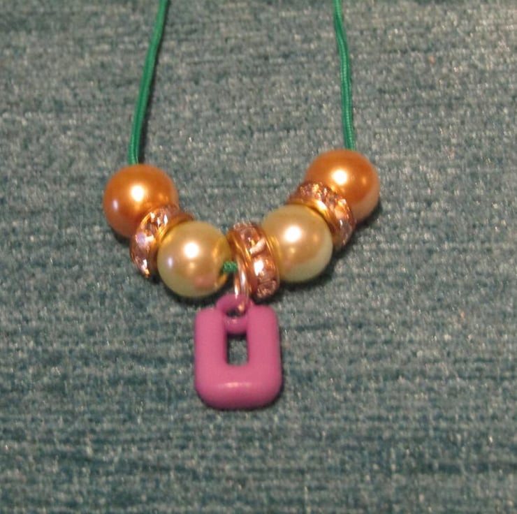 Made with green waxed cord, multi-coloured glass pearls, rhinestone rondelle spacer beads and acrylic letter charms. Suitable for ages 2 and up.