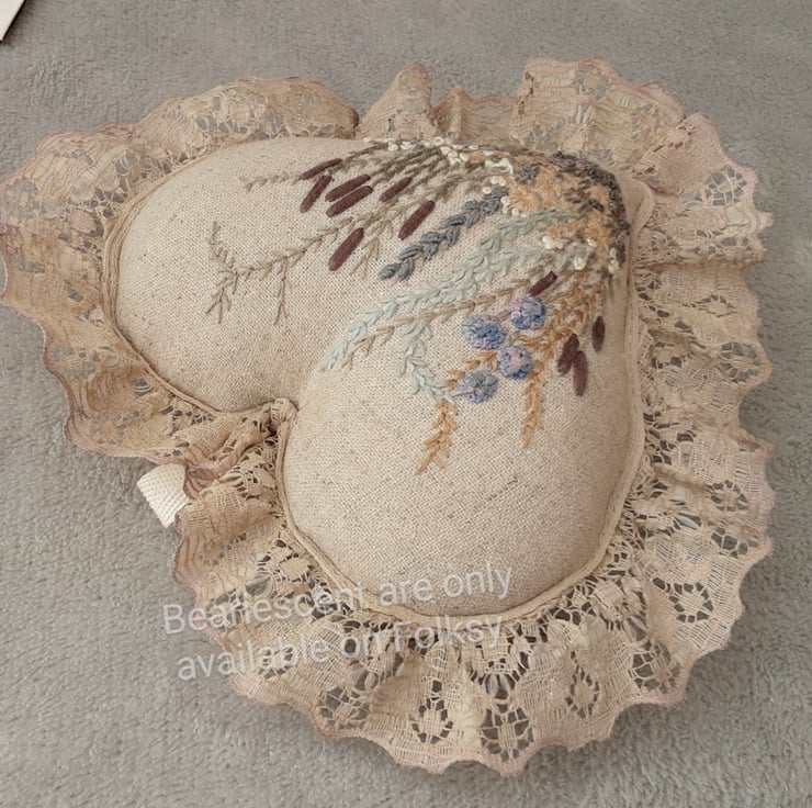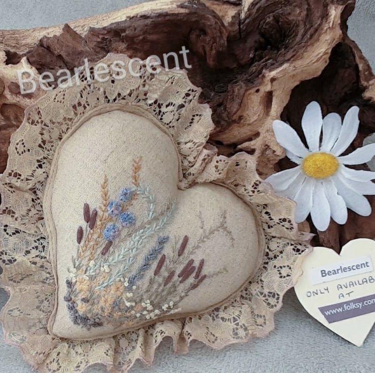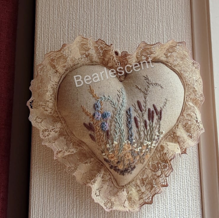 This is a beautifully detailed hand embroidered heart, filled with super polyester filling and a small organza bag containing dried lavender to give a beautiful fragrance.