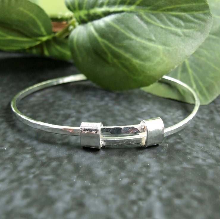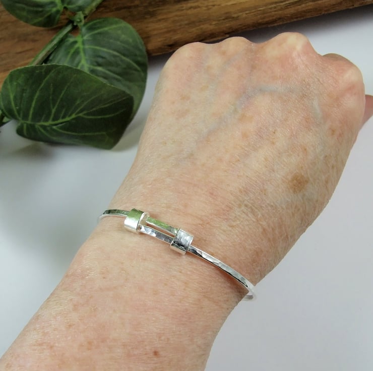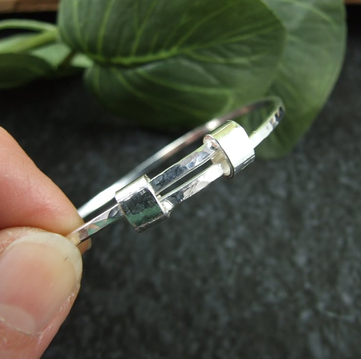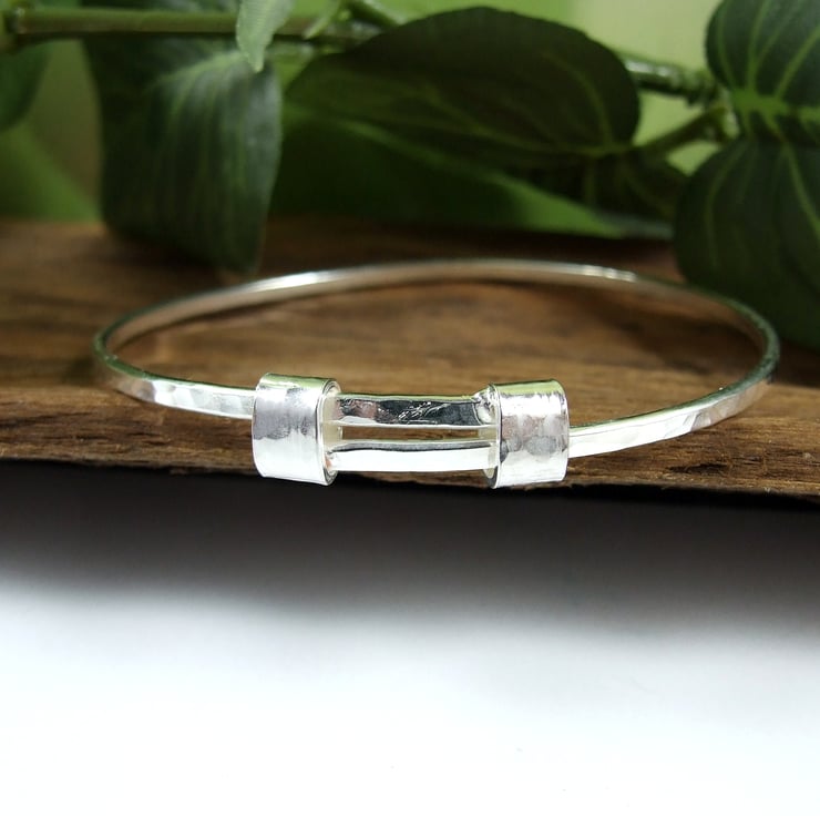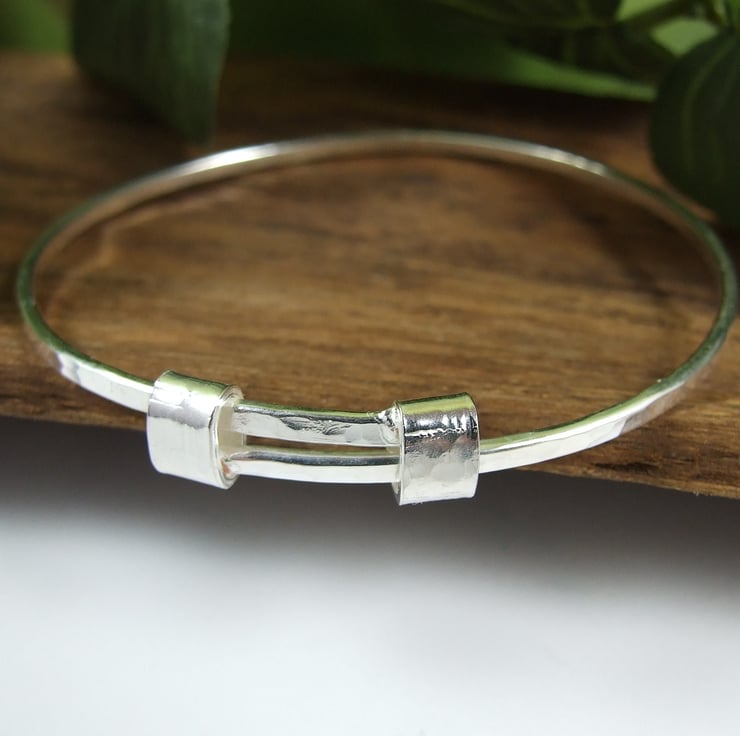I have made the bangle from 2mm wide sterling silver wire, hammered for texture and then solderd in place two sliders overlapping to create an adjustable fit and given it a bright polished finish.