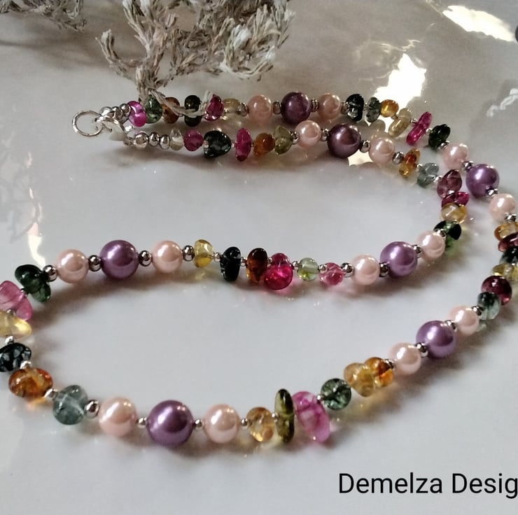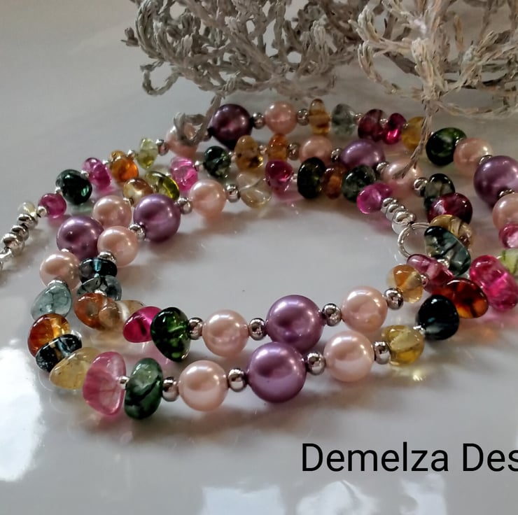 A beautiful striking necklace designed and hand crafted in Cornwall using pebble irregular cut multicoloured genuine quartz complimented with deep pink and salmon pink shell pearls. Between them are quality 4mm and 2.5mm silver plated spacer beads adding a touch of sparkle and an opulent look.