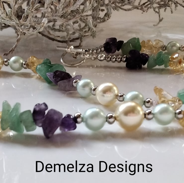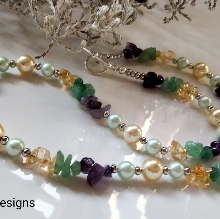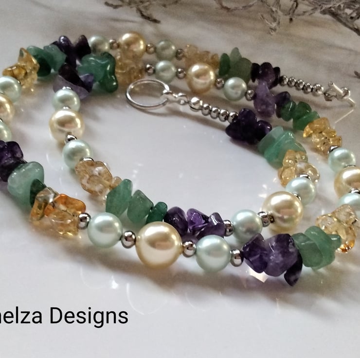 A beautiful striking necklace designed and hand crafted using irregular cut medium size nuggets to include genuine citrine, green aventurine and amethyst complimented with mint green and deep cream shell pearls. Between them are quality 4mm and 2.5mm silver plated spacer beads adding a touch of sparkle and an opulent look.