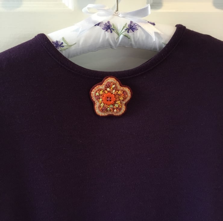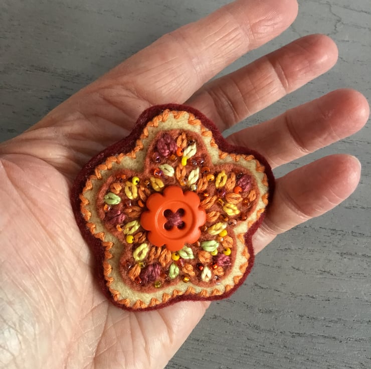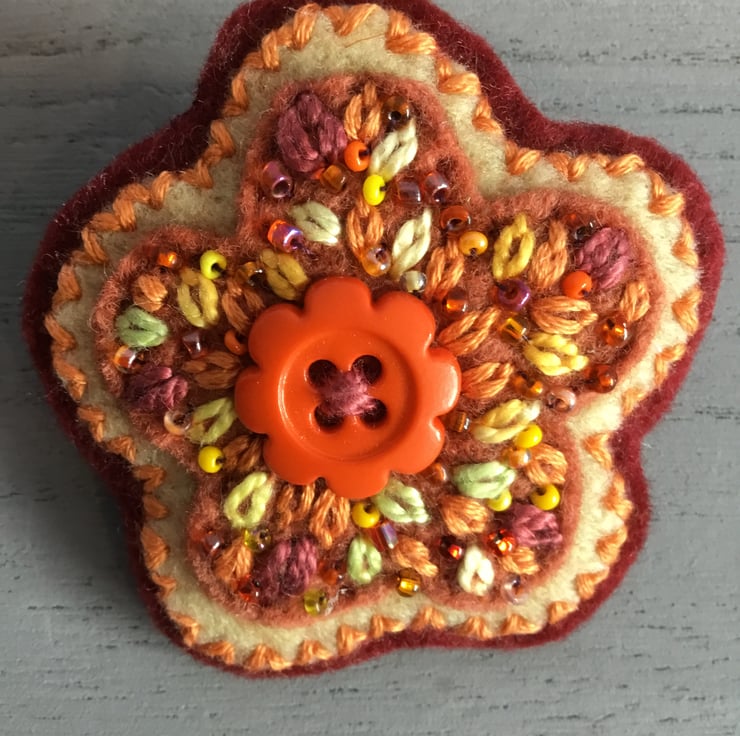 This flower shaped Hand Embroidered Sunny Flower Brooch, has five felt petals in shades of warm sunshine……amber, orange and pale yellow. An orange Flower shaped button is sewn in the centre of this felt Flower. Hand embroidered Lazy-Daisy Stitches and seed beads in an array of lovely orange, yellow, amber and golden colours, surround this central Flower button.