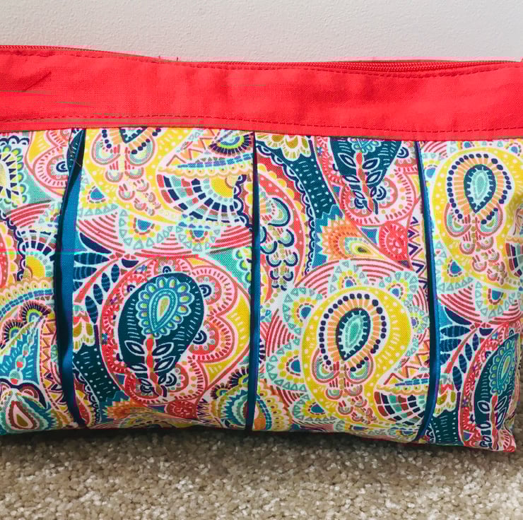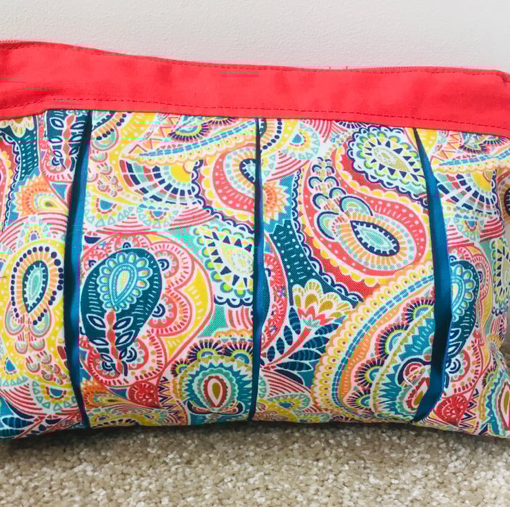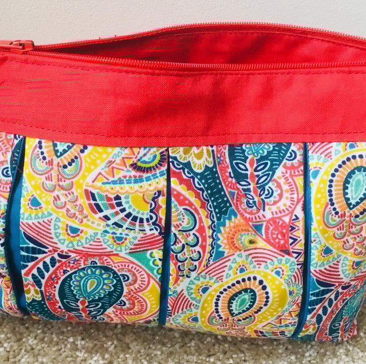 A handmade box pleated makeup bag made from a colourful paisley patterned cotton fabric, with accents of blue and red.