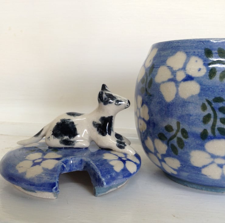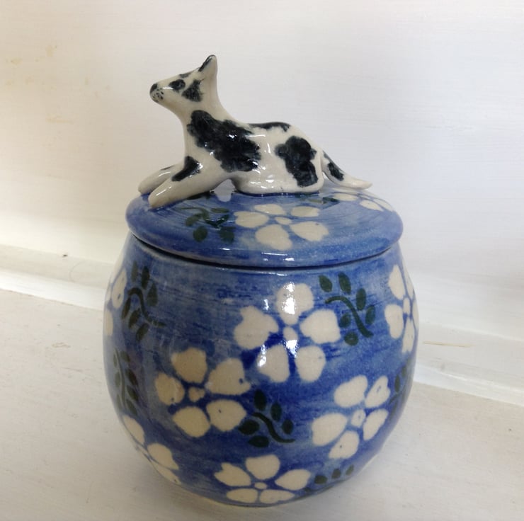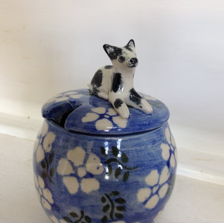 Really charming hand thrown sugar bowl or jam pot with a little black and white sculpted mongrel dog on the lid. The bowl is made from high fired stoneware clay and is decorated with white flowers and green leaves on a blue background. It has a clear glossy stoneware glaze. There is a space cut into the lid into which fits a hand modelled stoneware spoon. The whole piece measures 13.5 cms x 10 cms. The base of the pot is dishwasher safe and the lid should be hand washed.