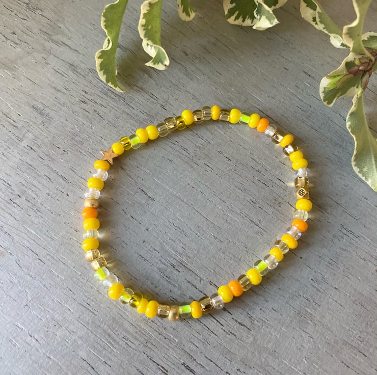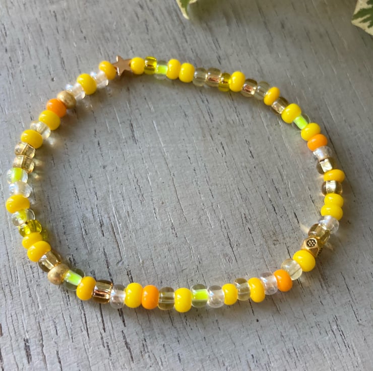 Pretty elastic bracelet made with little citrus-coloured seed beads and a gold-plated star. Coordinating earrings are also available. FREE DELIVERY in the UK.