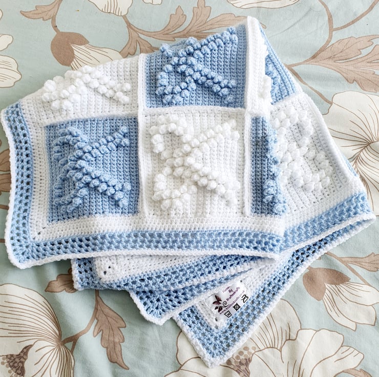 This beautiful baby blue and crisp white blanket would be the ideal size for a moses basket, crib, stroller or carrier.