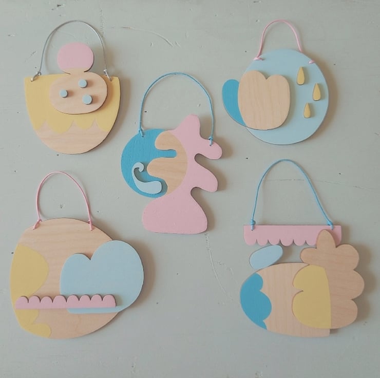 This hanging abstract decoration comes from an original doodles which have been recreated in high quality laser cut birch plywood, had a few random shapes added and painted in gorgeous pastel colours. It measures approx 8cm x 8.5cm (excluding string), and would make a nice gift for lovers of random shapes and pretty colours!