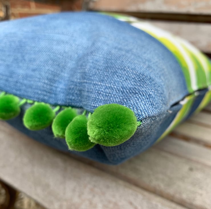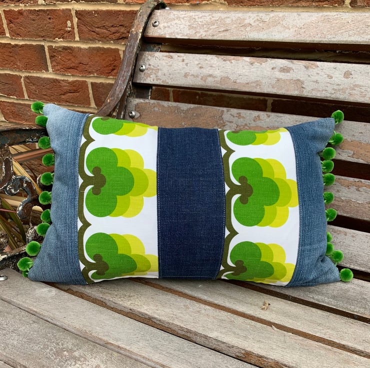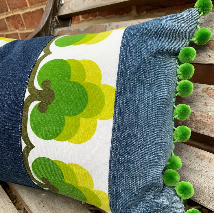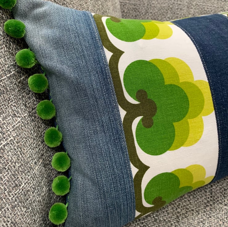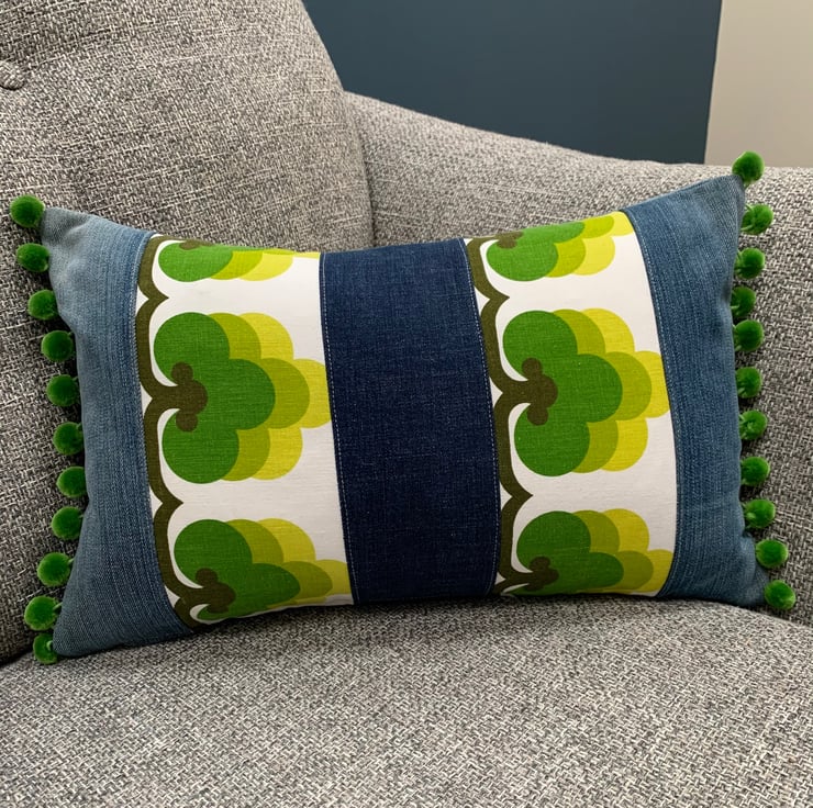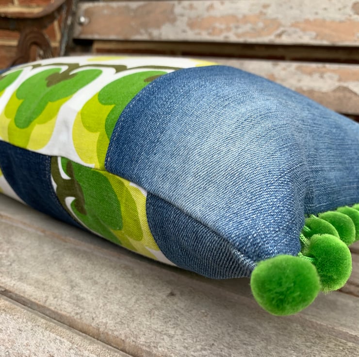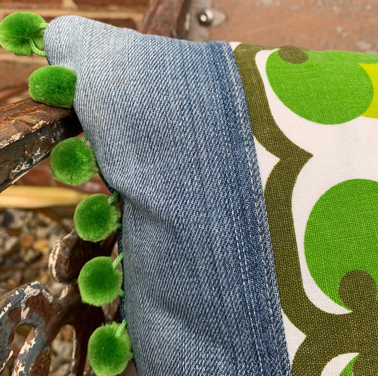 One of a kind cushion cover made from reclaimed fabrics. The denim comes from old jeans, softened and faded from wear. I found the retro print fabric at the local flea market, still very striking and fresh. Put together in an informal patchwork and finished with bright green pompoms, the result is a unique feature cushion cover.