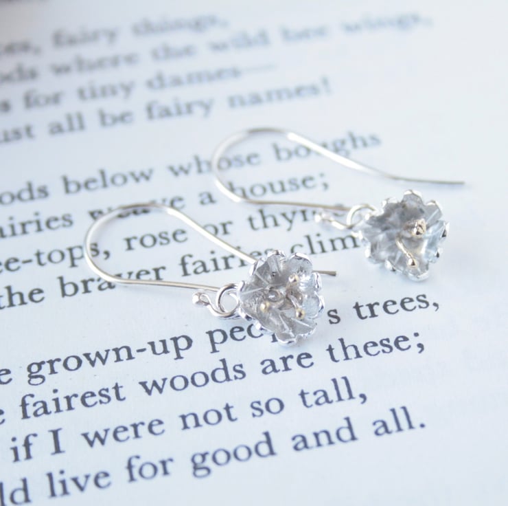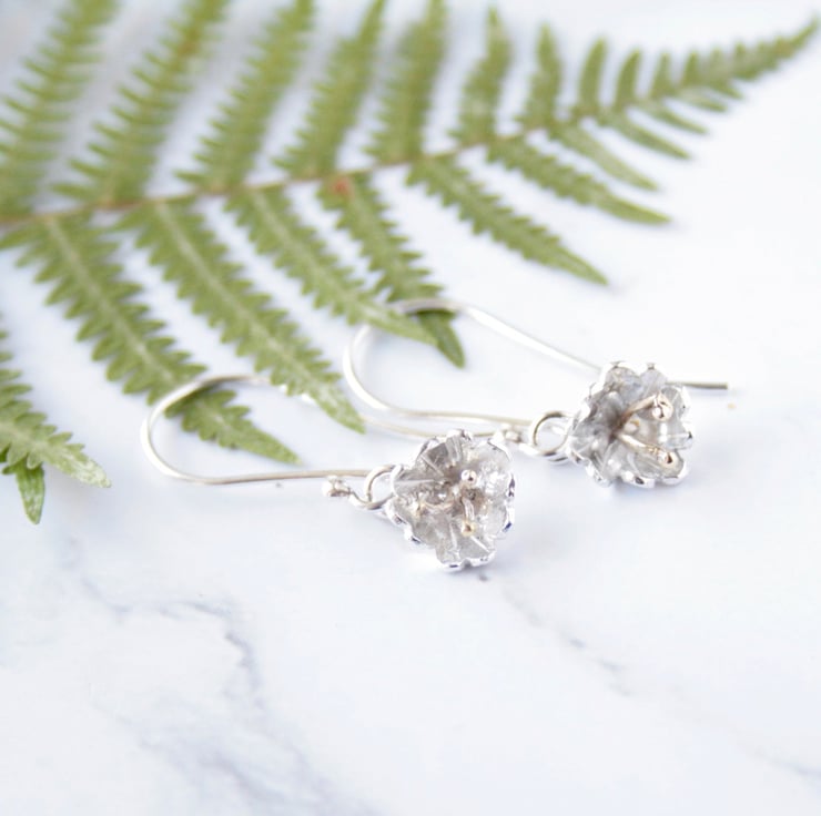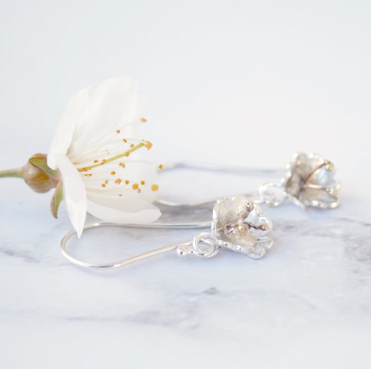Each pair is created by hand from sheets of sterling silver and silver wire and due to the handmade process small variations may occur in the shape of the flowers. The diameter of each flower is approximately 10mm and the total length of the earrings is approximately 30 mm. A matching pendant is also available from Thistledown Wishes.