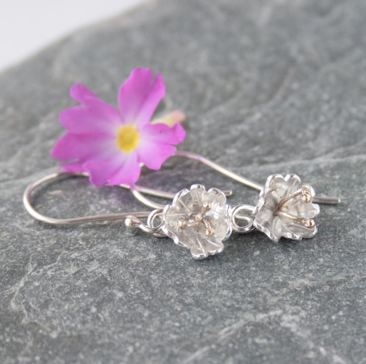 It was the pretty form of cherry blossom that inspired the design of these long silver flower earrings. I have created them from sterling silver and added little brass stamen to the centre. The flowers hang from sterling silver ear wires and are free to gently move when worn.