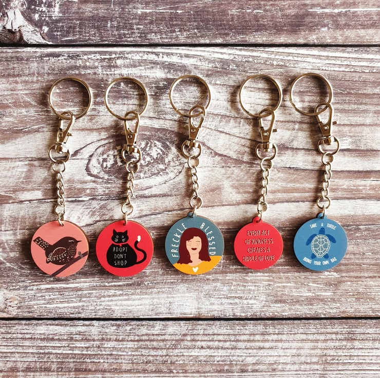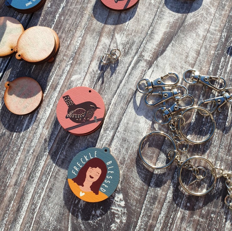 The charms are around 35mm in size and the wood is digitally printed with my designs before being laser cut. They come displayed on a recycled paper backing card.